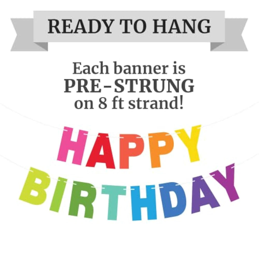 This vibrant, pre-strung Happy Birthday banner is the perfect addition to any birthday celebration. Unlike others, our banner comes ready to hang, saving you time and effort by eliminating the need for DIY assembly. Each letter is securely attached to an 8 ft strand with smaller punch holes to ensure they stay in place, even at an angle, so you won't have to worry about them sliding down. The colorful, rainbow design is carefully crafted to add a fun, lively touch to your party, creating a festive atmosphere that will make your celebration stand out. With no setup required, you can simply hang the banner and enjoy your event.