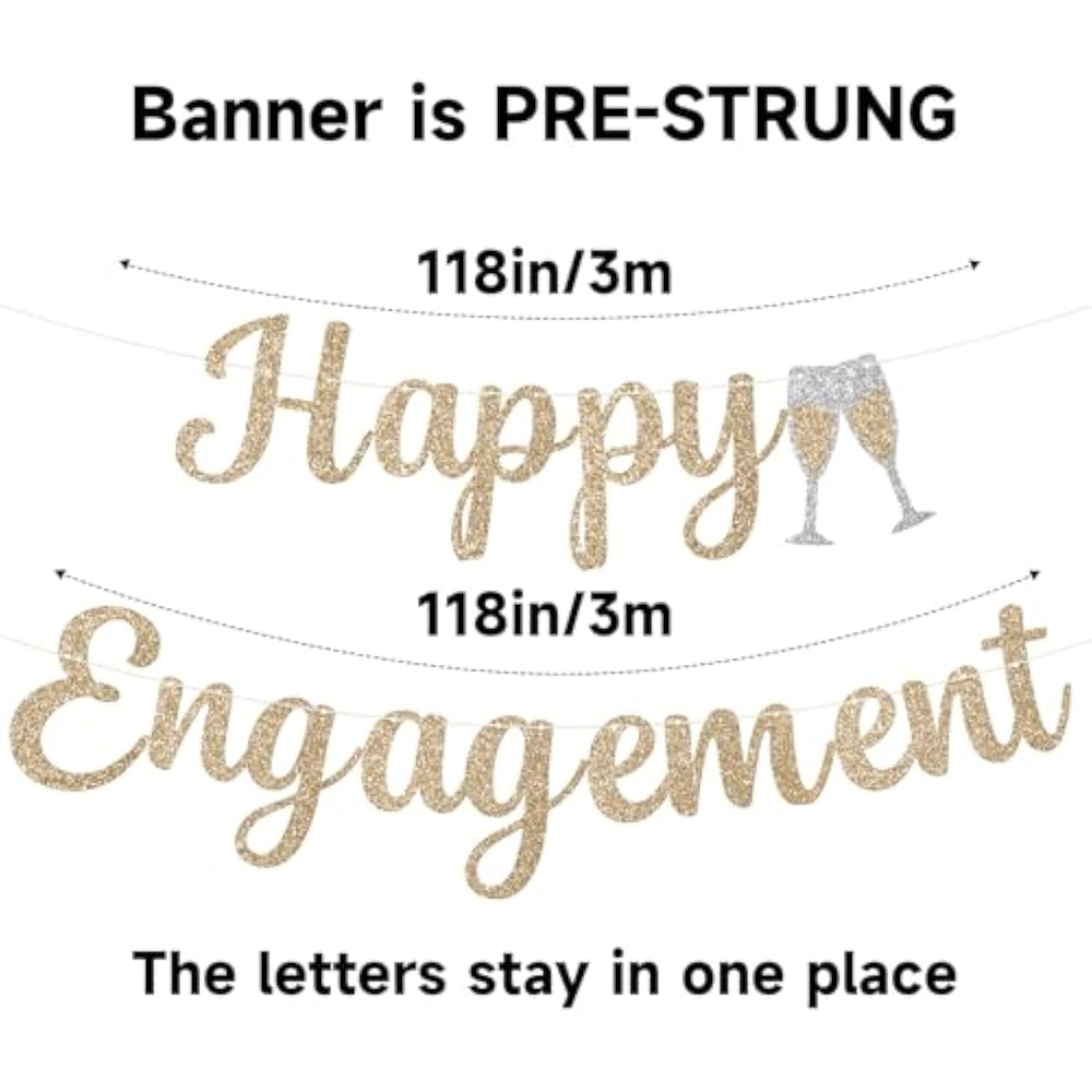 | [Engagement Party Decorations]-Happy Engagement Banner Is Glittery And Elegant, Perfect For Wedding, Bridal Shower, Bachelorette, Engagement Party Decoration, Making Your Party More Atmospheric. You Can Decorate Gift Dessert Table, Living Room, Wall, Fireplace, Window, Garden And More. Happy Engagement Sign Even Use As A Photo Backdrop. | | [Pre-Strung Engagement Banner]-No Diy Needed. Gold Happy Engagement Banner Is Already Pre-Strung. You Can Hang Engagement Sign Right Now! | | [Good Material]-Pre-Strung Wedding Banner Is Made Of 350 Gms Cardstock, Strudy And Reusable. | | [Adjustable Distance]-Bridal Shower Banner Can Adjust The Space Between Banner. Smaller Punch Holes Keep Letters In One Place, Easy To Hang. | | [What You Get]-You Will Receive 17 Paper Banner That Spell The Phrase "Happy Engagement" And 2 Champagne Flute Banner. Each Letter Measures Approx. 7.1 Inch X 5.1 Inch. The Each Rope Measures About 3M. If You Have Any Problems About The Product, Please