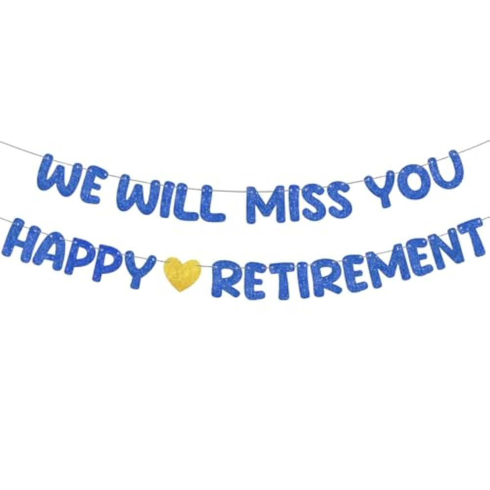 300G Glitter Card Stock | No Diy Assembly: Our Retirement Banner For Women And Men Has Been Pre Strung For Ready To Hang, Simply Remove It From The Package, Unfurl, And Hang It Up, Which Is A Time Saving And Convenient Party Decoration For Most Important Occasions | Quantity And Size Information: This Set Of Retirement Banners Includes 2 Pieces, Namely Happy Retirement Banner, And We Will Miss You Banner, Which Measures About 11.4 Ft/ 3.5 M In Length, And The Letter Measures About 6.3 Inches/ 16 Cm In Height, Both Of Them Are Navy Blue, Please Double Confirm The Size Information Before Buying | Novel Retirement Banner: These Funny Retirement Decorations Adopt Humorous Twist With [Happy Retirement] Banner And [We Will Miss You] Banner, With Red Heart In The Middle, And Feature Glitter Effect On One Side, Which Not Only Charms Your Guests, But Also Offers A Funny And Stylish Sentiment To The Retiree | Retirement Celebration: These Happy Retirement Decorations Are Honoring A Good Person Who Has Worked Tirelessly For His Or Her Retirement, Suitable For Various Types Of Retirement Parties, Like Going Away, Army Retirement Party, Graduation, Work, Farewell And So On, Providing An Unforgettable Celebration For You And Your Loved Ones | Long Service Life: These Retirement Party Decorations Are Made Of Sturdy 300G Glitter Card Stock Material That Not Only Improves The Visual Attractiveness Of Your Party Decor, But Also Has A Lengthy Lifespan; Whether You Decide To Have An Outdoor Or Indoor Retirement Celebration, They Can Catch Guests' Attention Because Of Their Luster And Glitter Effect |