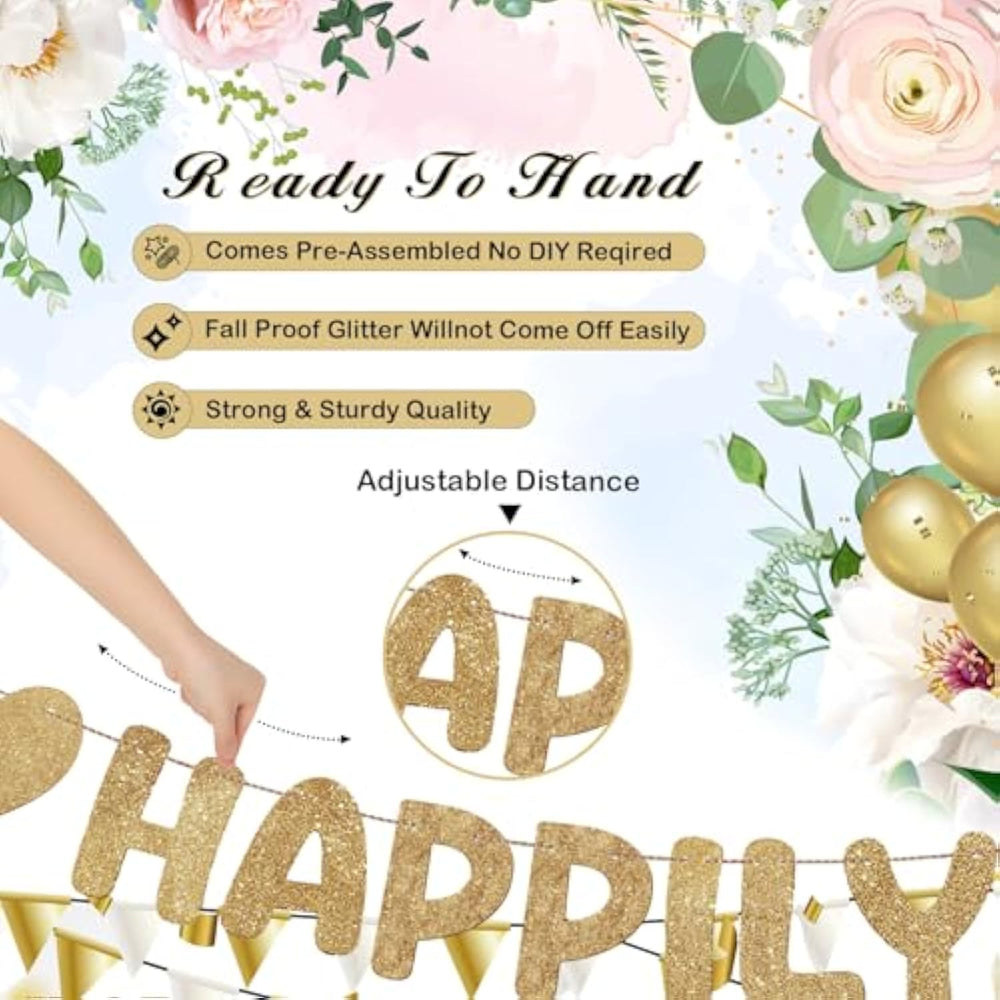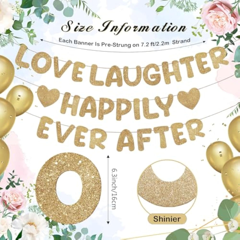 | Complete Bridal Banner Set: Our Gold Bridal Shower Banner Includes A Love Laughter Happily Ever After Banner Set Which Comprises 5 Words And 2 Hearts; This Complete Set Allows For A Symmetrical And Balanced Decoration, Enhancing The Overall Aesthetic Appeal Of Your Event | | Easy To Use: Our Love Laughter Happily Ever After Banner Are Already Pre Strung, No Diy Required And Save Time; The Bridal Shower Banner Length Approximately 9.84 Ft/ 3 Meter, Is Long Enough To Decorate Your Party And Can Be Easily Installed And Removed From Walls And Backgrounds | | Reliable Material: Each Letter Pendant Of The Gold Glitter Bridal Party Banner Approximately 6.3 Inches/ 16 Cm Is Made Of Strong Cardstock Material, Durable And Lightweight, Also Easy To Hang And Reusable; Champagne Gold Glitter Adds An Extra Touch To Elevate The Quality Of Your Party And Make Your Party Sparkle To Differentiate It From Others | | Multiple Occasions: Our Glitter Wedding Shower Decorations Are Very Cute And Bright, Can Easily Attract The Attention Of Guests, Is A Good Choice For Bridal Shower, Wedding Party, Bachelor Party, Engagement Party, Bridal Party Decor; You Can Easily Add Them Railings, Windows, Dessert Tables, Even Use Them As Photo Backgrounds To Add Many Features To The Event And Leave Fun Memories | | Create A Memorable Atmosphere: Spice Up Your Bridal Shower With This Bachelorette Party Sign Garland To Amazed Everyone At The Event; Use This Creative Bridal Decoration To Make Your Party Fun And Sweet, Let Everyone Immerse In Happiness And Joy, And Fulfill Every Girl'S Dream | |