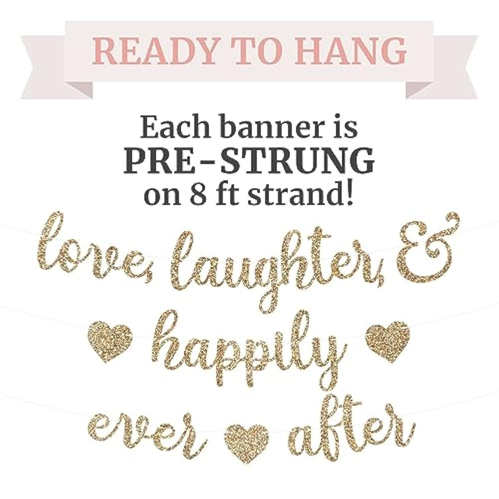 ?? Pre-Strung = No Wasted Time Putting Them Together - Unlike Others, Our Gold Love Laughter Happily Ever After Banner Will Arrive To You With Each Letter Already Pre-Strung On A 8 Ft Strand. No Diy Required! All You Have To Do Is Hang And You’Re Ready To Go. | ?? Letters Won'T Slide Out Of Place - No Need To Worry About Constantly Adjusting Your Banner! Unlike Others, We Designed All Our Pre-Strung Bridal Banners To Have Smaller Punch Holes; The Letters Will Stay Put And Won'T Slide Down The 8 Ft Strand. Just Position As Desired And Letters Will Stay, Even At An Angle! | ?? Real Glitter Adds Real Sparkle To Your Party - Meticulously Hand Designed, We Made Sure Our Bachelorette Wedding Banners Were Super Cute And One-Of-A-Kind. The Real Gold Glitter Sets Us Apart From Other Bridal Banners And Will Set Your Bridal Party Apart Too! The No Diy Banners Save You Time And Add That Extra Touch To Elevate Your Party! | ?? Thick, High Quality Cardstock Made To Last - Each Letter Pendant Is 7" X 5" And Is Made From Strong 350 Gsm/130Lb Cardstock, So That You Can Easily Fold Up To Store Or Pass It On To A Friend For Their Event! ?The Real Gold Glitter Adds The Perfect Touch To Your Bridal Wedding Decorations. You Can Easily Add Them To Mantels, Banisters, Windows, Dessert Tables, Or Even Use As A Photo Backdrop. The Options Are Endless! |