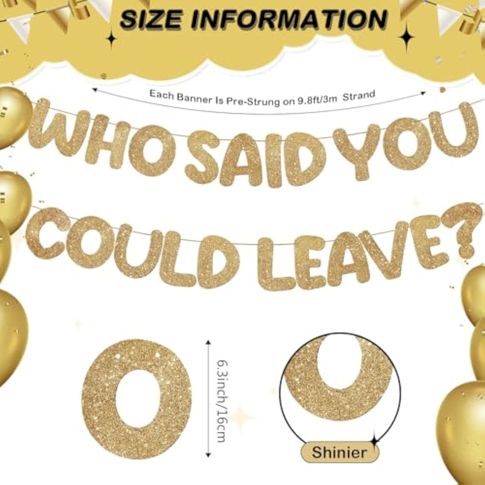 | Paperboard | | Convenient Package: Enjoy The Convenience Of Receiving A Full Package Which Includes 1 Glitter Who Said You Could Leave Banner; Blessed With Easy Mounting Capability And Friendly Usability, You'Re Assured Of A Stress Free Setup To Any Farewell Scenarios | | Generous Size Dimensions: The Glitter Going Away Decorations That Read [Who Said You Could Leave] Is 9.8 Feet Long While Each Word Measures Approximately 6.3 Inches In Height; These Are Incredible Dimensions Designed To Provide Easy Visibility And Also To Deliver A Strong Heartfelt Send Off Message | | Ready To Hang: Our Glitter Who Said You Could Leave Farewell Banner Comes Pre Strung And Ready To Hang, Saving You Time And Eliminating Any Setup Hassle; Get Right To The Farewell Celebrations Without The Need For Additional Accessories Or Assembly | | Quality Material: Experience An Extraordinary Who Said You Could Leave Decorations Made From Quality Paperboard; Kept To Resist Wear And Tear, This Banner Delivers Longevity And Stable Standing Performance During Your Send Off And Farewell Parties; The Durable And Sturdily Built Material Adds Up As The Banner'S Longevity Provider For Numerous Goodbye Occasions | | Multi Scenario Application: Whether Applied For Farewell Parties, Retirement Parties Or Other Goodbye Decorations, Our Glitter Who Said You Could Leave Going Away Banner Is Applicable In Numerous Scenarios; Its Universal Design And Message Make It An Ideal Accessory For Creating Unforgettable Memories In Various Celebrations | |