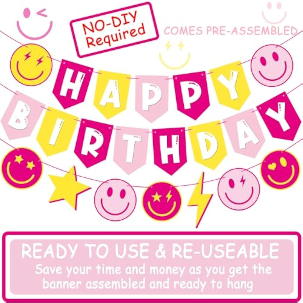 | ?Preppy Birthday Party Banners?There Are 3Pcs Rose Red, Pink And Yellow Preppy Birthday Party Banners In This Package, Three Banners Are Divided Into 1Pcs 'Happy', 1Pcs 'Birthday' And 1Pcs Preppy Themed Cutout Banner. A Total Of Three Banners And All Pre-Strung, Received Products Can Be Used Directly, Saving You A Lot Of Time. | | ?Double-Side Printing Smiley Face Theme Cutout Banners?All Cutouts And Letters Of Our Preppy Birthday Banners Are Printed On Both Sides, The Pattern Is Not Only Clear But Also Vivid. The High Definition Printing Technology Allows The Banner To Remain Bright After A Period Of Use. | | ?Special Design Preppy Birthday Decoration?This Preppy Birthday Party Hanging Decoration Is Not Only Perfect Size But Also Unique Design. Each Letter Of Happy Birthday Is Designed In 3 Colors(Rose Red,Pink, Yellow), Unique Decorations To Add A Lot Of Fun To Your Party. | | ?How To Use Preppy Smile Face Birthday Banner?The Preppy Birthday Decoration Is Designed For Easy Layout, You Just Need To Decide In Advance Where To Hang, Such As Room Walls, Living Room Chandeliers, Porches, Stair Railings, Tree Branches And So On. All It Takes Is One Step To Light Up Your Party. | | ?Smile Face Lightning Star Theme Party Supplies?Enjoy The Happy Moment With Your Friends And Family. Preppy Theme Banner For Multiple Occasions, For Example, Preppy Party, Smile Face Themed Birthday, Lightning Star Themed Party, Back To School Party, Bachelorette Party, Holiday, Etc. | |