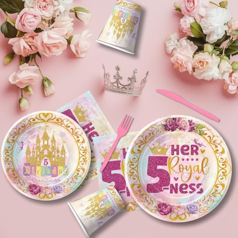 | ?Princess 5Th Birthday Decorations?Princess-Themed Birthday Magic, Make Your Little Girl’S 5Th Birthday Like A Royal Celebration With This Elegant Pink And Gold Tableware Set, Fit For A True Princess | | ?Package Included?Princess 5-Year-Old Birthday Table Decorations, Dinnerware Included 24Pcs 9'' Princess 5Th Birthday Paper Plates, 24Pcs 7'' Her Royal 5Ness Birthday Party Plates, 24Pcs Napkins, 24Pcs Paper Cups, 24 Sets Of Disposable Cutlery, For Girl Crown Castle Theme 5Th Birthday Party | | ?Easy Cleanup?Say Goodbye To Post-Party Cleanup Stress! Our Disposable Princess Fifth Birthday Table Decorations Tableware Kit Makes Tidying Up A Breeze. Simply Gather The Used Items And Dispose Of Them, Allowing You To Spend More Time Enjoying The Festivities And Less Time Washing Dishes | | ?Nice For Little Royals?Ideal For Princess Birthday Parties, Princess Five-Year-Old Birthday Party, Tea Parties, Playdates, Or Dress-Up Events—Turn Any Gathering Into A Royal Celebration | | ?Quality Materials?Made From Quality Paper Materials, This Princess Party Supplies Tableware For 5Th Birthday Is Enough To Hold Snacks, Cake, And Drinks Without Tearing Or Leaking, And Is Fully Disposable For Fast, Hassle-Free Cleanup | |
