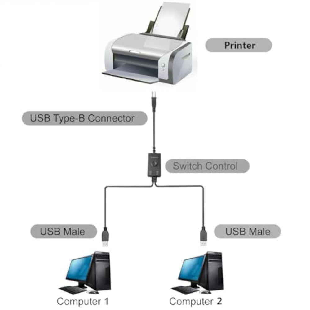 | The Printer Cable Can Share One Printer To Two Computers, And The Key Switch Can Be Switched To The Computer That Needs To Print At Will, Which Is Convenient And Flexible. | | Usb2.0 Data Transmission Speed Is Up To 480 Mbps, Allowing You To Print Out Everything You Want Faster, And Is More Stable Than Wireless Connections. | | Compatible With All Computer Usb Type A Ports (3.0 Compatible, But Only 2.0 Speed), And No Operating System Restrictions. | | Unique Switch Button Switching Method, Press To Connect To Cable 1, Pop Up To Connect To Cable 2, Easy Switching. No Power Supply Or Driver Required, Plug And Play. | | The Package Includes: Usb Splitter Cable *1 (6.5Ft/2M), Providing 18-Month Service And 24-Hour Online Qa. | |