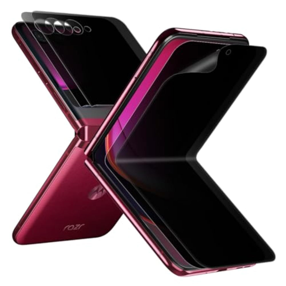 | ?Compatible Device Perfect Fit? Exclusively Designed For Motorola Razr 50 Ultra 2024, Comes With 2 Pack Inside Privacy Screen Protector + 2 Pack Front Privacy Screen Protetor. * Please Check Your Phone Model Before Purchasing. | | ?Protect Your Privacy? The Advanced Micro-Louver Technology In The Film Ensures That The Screen Remains Clear When Viewed Directly From The Front While Limiting Visibility Beyond 30 Degrees To Either Side. This Effectively Protects Your Personal And Sensitive Information From Prying Eyes, Especially In Public Places Such As Elevators, Buses, And Subways. | | ?Powerful Self-Healing Performance? The Advanced Self-Healing Layer Of Our Epu+Tpu Material Keeps The Screen Protector Looking Fresh By Automati
