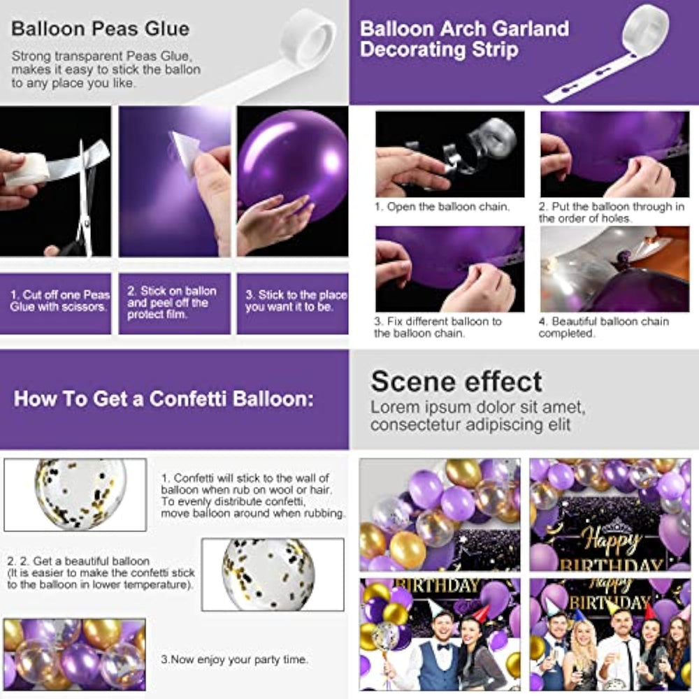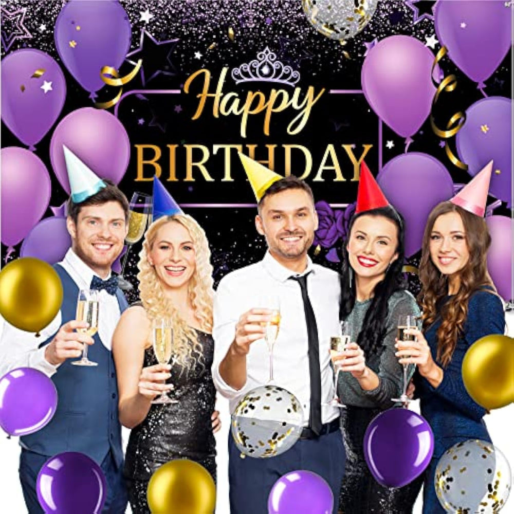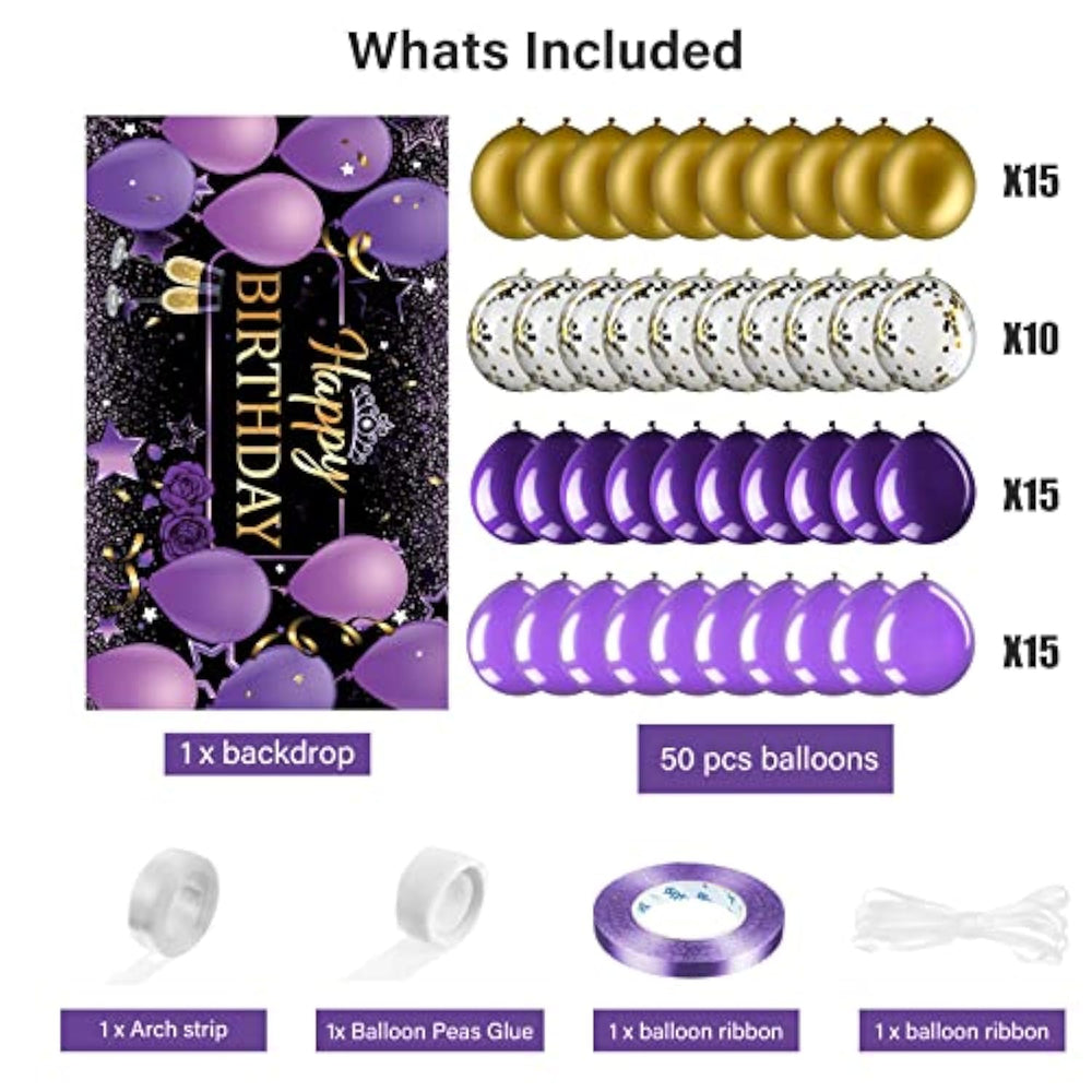 Package Included: You Will Get 1 Purple Gold Happy Birthday Photography Backdrop Banner, 50 Purple And Gold Balloons, 1 Roll Of Balloon Glue, 1 Roll Of Balloon Ribbon, 1 Roll Of Backdrop Ribbon, A Charming Purple Gold Themed Birthday Decoration That Will Be An Attractive Eye Catching Elegant Party Decorations To Brighten Your Party | Ideal Photography Backdrop: Purple And Gold Birthday Banners Are Made Of Thick Polyester Fabric, Colorful, Tear Resistant, Foldable, Portable, Washable And Reusable; At The Same Time, This Purple And Gold Birthday Backdrop Is Big Enough, Measuring 180 X 110 Cm/ 71 X 44 Inches, It Can Be Applied To Take Pictures With Your Family And Friends Before, Bringing Beautiful Photos For Your Birthday | Charming Purple Gold Birthday Decorations: The Combination Of Purple And Gold Is Elegant And Noble; Our Birthday Decoration Sets Are Not Only Suitable For Girlfriends, Girls, Mothers Birthdays, But Also For Purple Theme Parties, This Purple Birthday Set Is Ideal For Birthday Party Decorations For Women Of Different Ages | Easy To Use: Our Purple Gold Birthday Decoration Comes With Glue And Balloon Chains, You Can Easily Make Balloon Arch Decorations With Friends Or Family, And It'S Really Fun, The Purple Happy Birthday Banner Has 4 Grommets In The Corners, So You Can Easily Hang It Anywhere You Want By Simply Tying Up The Rope We Provide | Meaningful Party Events: Purple Gold Themed Birthday Party Decoration Banners Are Nice Birthday Party Supplies, Ideal For Purple Themed Birthday Parties, You Can Write Wishes On It With Your Family And Friends And Take Photos For Your Birthday To Leave The Next Unforgotten Memory |