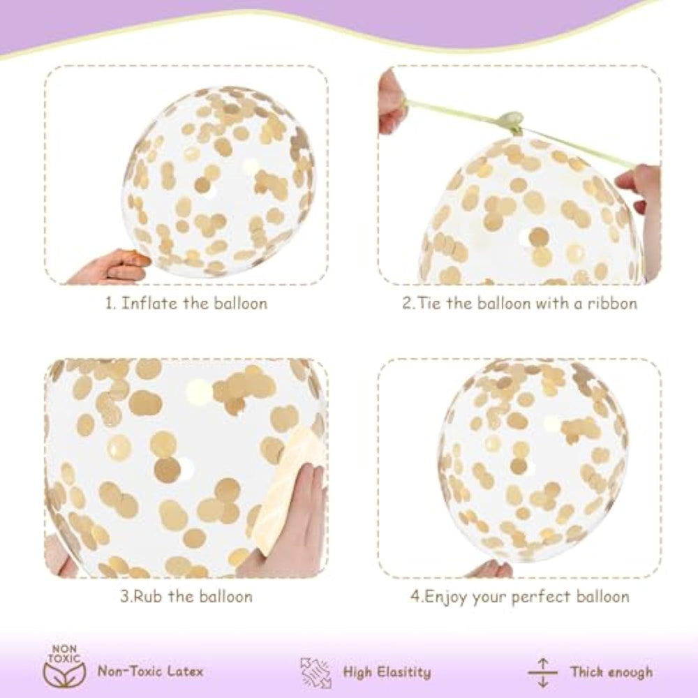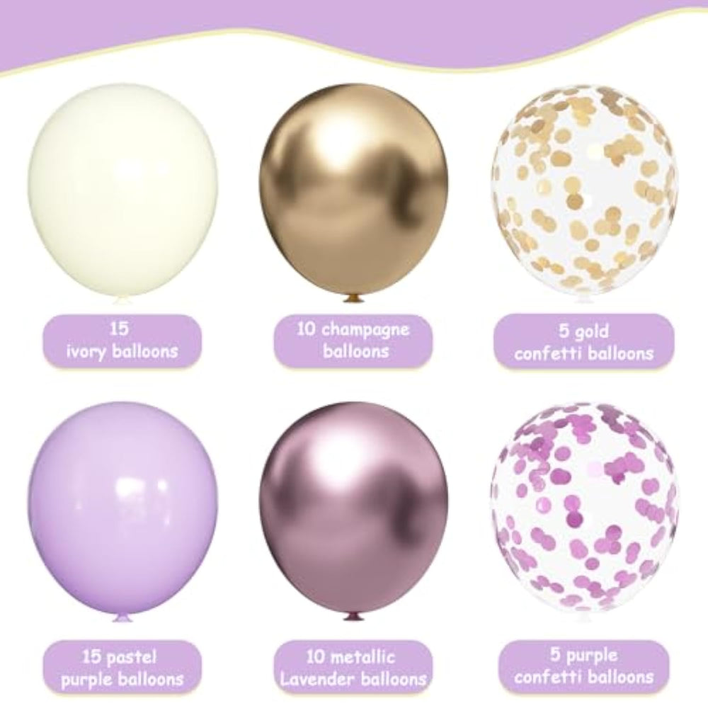 | ??Safe To Use?: The Purple Gold Confetti Balloons Party Decorations Are Made From Natural Latex Material, With High Quality, Non-Toxic, Non-Odor And Safe For Kids.The Balloons Are Thick Enough So It Would Not Easy To Explode. | | ??Valuable Combination?: The Purple Gold And White Balloon Arch Kit Includes 15 Pastel Purple Balloons, 15 Ivory Balloons, 10 Metallic Lavender Balloons, 10 Champagne Balloons, 5 Purple Confetti Balloons And 5 Gold Confetti Balloons, 1 Roll Of Light Purple Ribbon And 1 Roll Of Gold Ribbon. All Balloons Blow Up To About 12 Inches In Size. | | ??Excellent Quality?: The Purple And White Balloons Party Decorations Can Be Filled With Both Air And Helium,Because Of The High-Quality Materials,You Can Even Prepare The Party One Day In Advance. You Just Need Tie Them And Put Them Into Anywhere You Want. | | ??Widely Applicable?: This Purple Gold And White Balloons Party Decorations Are Great For Different Kinds Of Celebrations, Baby Showers, Valentine'S Day Parties, Graduation Parties, Anniversaries, Weddings, And Birthday Party For Girls And Women. | | ??Notice?: Please Avoid Overfilling The Balloon And Exposure To Strong Winds, Direct Sunlight, Overheating, Sharp Objects, And Excessive Friction. Noting That Under Normal Storage Conditions, There Is A Possibility Of 1-2 Balloons Having Flaws. | |
