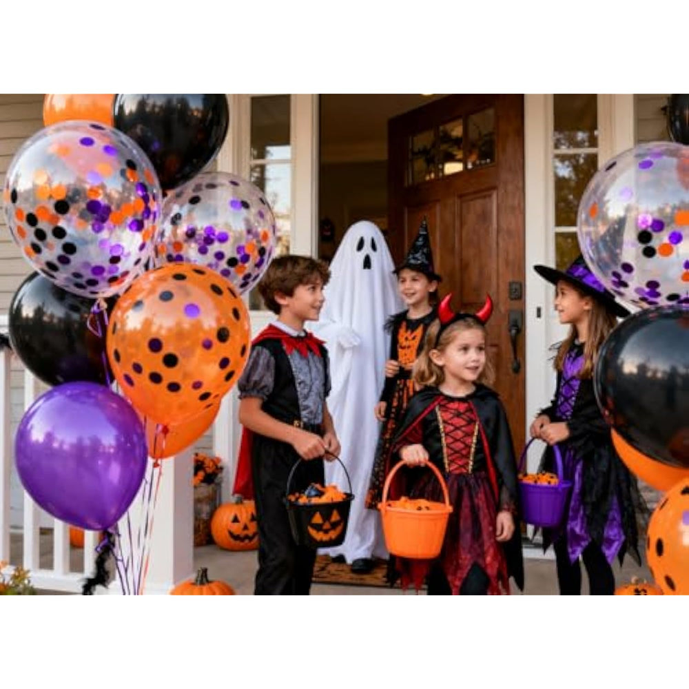 This balloon set includes 15 orange, 15 black, 10 dark purple, 10 purple, and 10 confetti balloons in orange, black, and purple, along with two 32ft ribbons, each balloon measuring 12 inches when inflated. Made of high-quality natural biodegradable latex, these balloons are non-toxic, eco-friendly, and safe for both kids and adults. Easy to inflate with helium or an electric pump, they are perfect for creating balloon arches and decorating birthdays, weddings, baby showers, holidays, and festive celebrations such as Halloween, Christmas, and New Year.