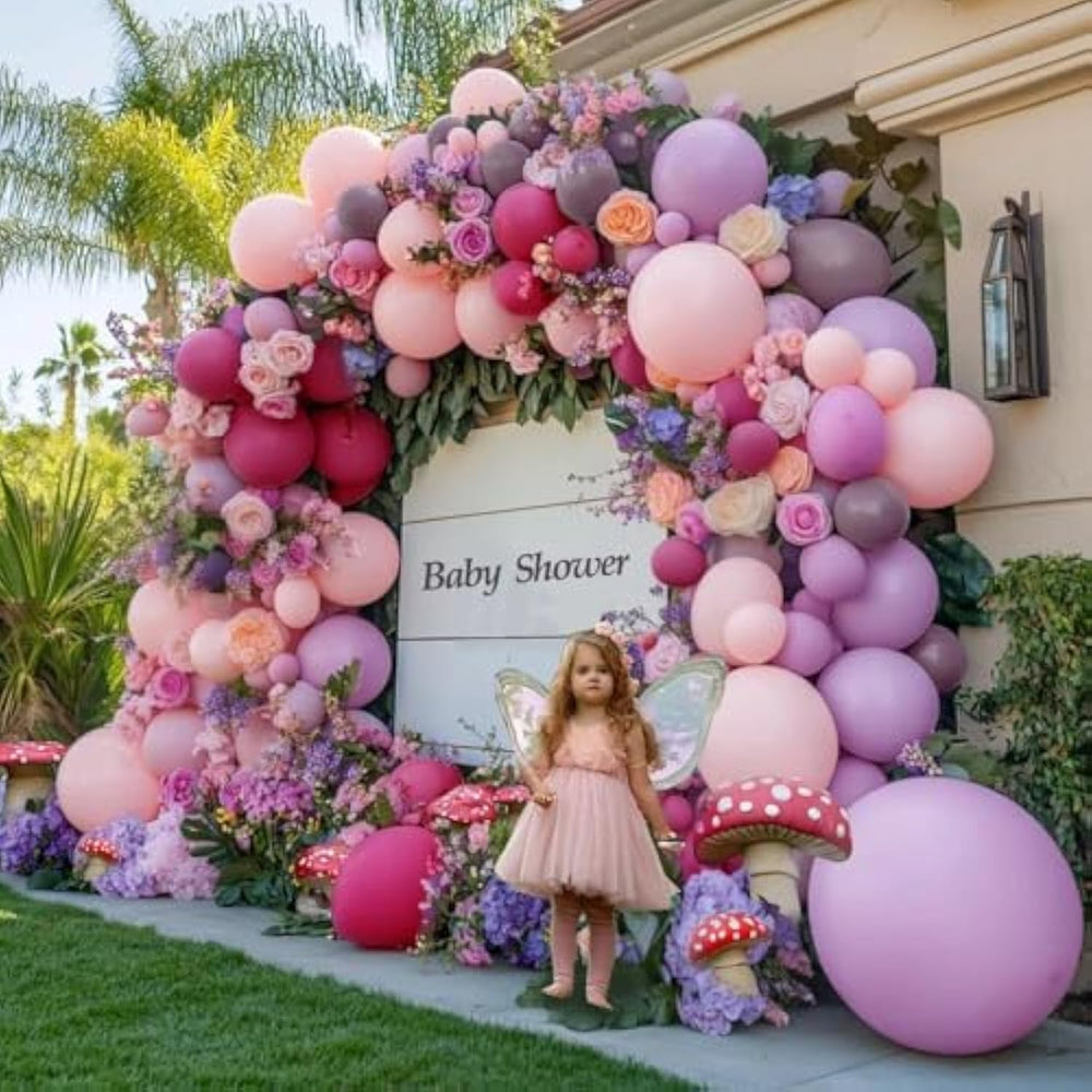 This 103-piece Pink and Purple Balloon Garland Kit features a dreamy mix of double-stuffed lavender, hot pink, baby pink, and dusty shades in various sizes (5", 10", 12", and 18"). Made from high-quality, non-toxic latex, these balloons are durable and air-fill friendly—no helium needed. The set includes balloon glue dots, a strip, and ribbon for easy DIY setup. Perfect for baby showers, butterfly or princess birthdays, weddings, and fairy-themed parties, this pastel garland adds a whimsical, romantic touch to any celebration.