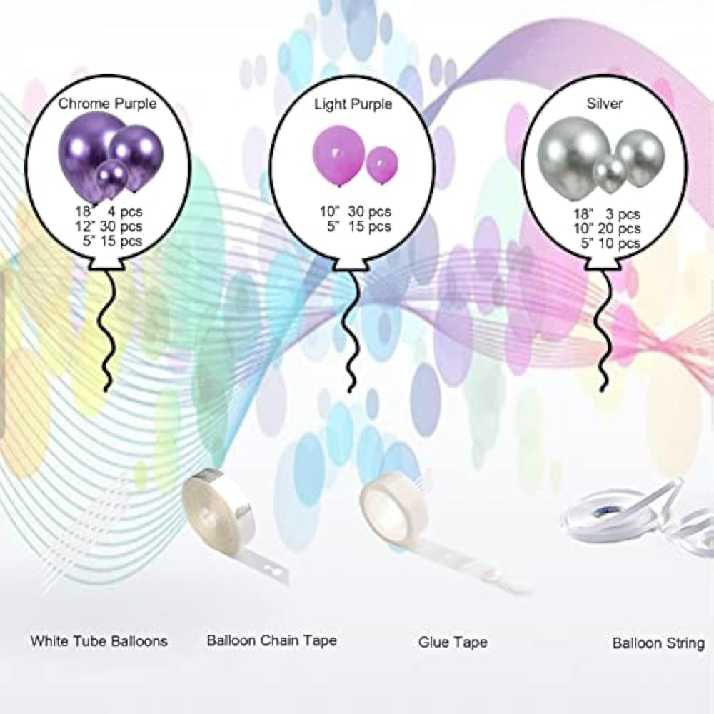 What You Get – 127 Balloons. Including 18” Chrome Purple 4 Pcs,18”Chrome Silver 3 Pcs. 12” Chrome Purple 30 Pcs, 10” White 20 Pcs, 10” Chrome Silver 20 Pcs, 10” Light Purple 30 Pcs, 5” Metallic Purple 15 Pcs, 5” Chrome Silver 10 Pcs, 5” Light Purple 15 Pcs, Glue Dot 1 Reel, Strip Tape 1 Reel, Hole Chain 1 Reel, White Tube Balloons 5Pcs For Organizing Balloons. | Easy To Assemble - Provided Whole Balloon Strip Kit,Help You Make Balloon Garland Or Arch Easier.Just Take 1 Hour To Put All Of Balloons Together Easily,Then Make A Professional Balloon Garland,Then Use Ribbon Or Hook And Tape It To The Ceiling Or Wall As A Background. | Not Need For Helium - Balloon Garland Just Filled With Air Not Helium,And It Will Stay In Balloons For Along Time At Least 7 Days,Save Your Time And Money. | Suitable For Various Occasions - The Avacado Green Balloon Garland Kit Is Perfect For Halloween, Retirement, Birthday Party, Graduation, Wedding, New Year Supply. This Is The Easiest Decoration With The Biggest "Wow" Factor At Any Party Indoor Or Outdoor As A Photo Booth Backdrop. | Worry-Free Purchase - Your Satisfaction Is Our Goal. Order Now, And Feel Free To Come Back To Us If You Have Any Questions Or Problems About The Balloons. We Will Help Until You Are Well Satisfied. |