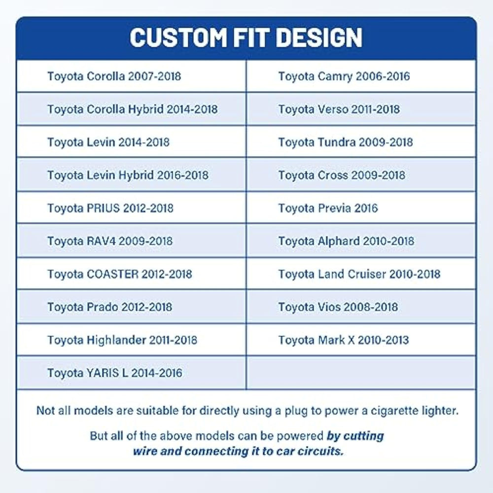 Usb Socket Adapter Replacement Fit The Hole Of 34X23Mm (1.34"X0.91"), For Toyota Corolla 2007-2018, Corolla Hybrid 2014-2018, Toyota Levin 2014-2018, Levin Hybrid 2016-2018, Toyota Rav4 2009-2018, Toyota Highlander 2011-2018, Toyota Prado 2012-2018, Toyota Land Cruiser 2010-2018, Toyota Verso 2011-2018. Toyota Coaster 2012-2018, Toyota Yaris L 2014-2016, Toyota Tundra 2009-2018, Toyota Cross 2009-2018, Toyota Previa 2016, Toyota Alphard 2010-2018, Toyota Vios 2008-2018. Toyota Prius 2012-2018. | | Dashboard Usb Extension Plug Is Powered By Cigarette Lighter, With 12-24V Input And Double 18W Working Power Output (5V/3A, 9V/2A, 12V/1.5A). The Extension Cable Is About 4Ft (1.2M) And Come With A 10A Fuse, So It Has Good Protection Against Over-Heating, Over-Current, Over-Voltage, Over-Load, And Short Circuit. | | Multi-Ports Car Usb Has Real-Time Voltage Monitors. The Blue Led Screen Display The Volt In A Actual Time When The Charger Is Connected To Power, Monitor Your Device'S Ch.
