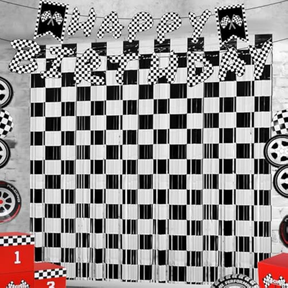 | Racing Car Themed Birthday Decoration Foil Curtain Backdrop: Including 2 Pack Checkered Black With White Foil Curtain Backdrop (Each Size 3.3 * 6.6Ft / 100Cm *200Cm/ Width * Height) And 1 Pack Black White Checkered Happy Birthday Banner Garland, Can Be Used With For Outdoor Indoor Race Car Birthday Party Decorations. | | Material: This Foil Curtain Is Made Of Metallic Tinsel. Lightweight, Clear Printing, Easy To Tear And Stick. The Pepaer Banner Is Made Of High Quality Cardboard, Easy To Strung And Hang On Anywhere You Wanted, Will Make Your Party More Bright And Unique. | | Themed Design: The Color Of Foil Curtain And Banner Include Black And White, Match With The Classic Color Of Racing Car Themed Events. The Design Can Combine The Racing Culture To Natural Birthday Party, Will Make A Different Racing Atmosphere For Your Celebration. | | Easy To Install: The Checkered Foil Curtain Backdrop Comes With Adhesive Backing, You Can Easily Peel Off And Stick On The Flat Surface Such As Living Room'S Wall, Window Frame, And Anywhere Where Is Flat And Clean. You Can Strung The Banner Easily With The Plastic Needle And Rope. | | Universal Appeal: These Checkered Foil Curtains Are The Ultimate Multi-Purpose Party Essential! Perfect For Race Car Birthday Bashes, Motorsport-Themed Celebrations, They Also Add High-Octane Style To Baby Showers, Gender Reveals, Weddings, Graduations, And Engagement Parties. Transform Classrooms For Back-To-School Events Or Pep Rallies With Speedway Spirit. Use Them As Eye-Catching Wall Backdrops, Dramatic Doorway Drapes, Or Dazzling Photo Booth Scenery. | |