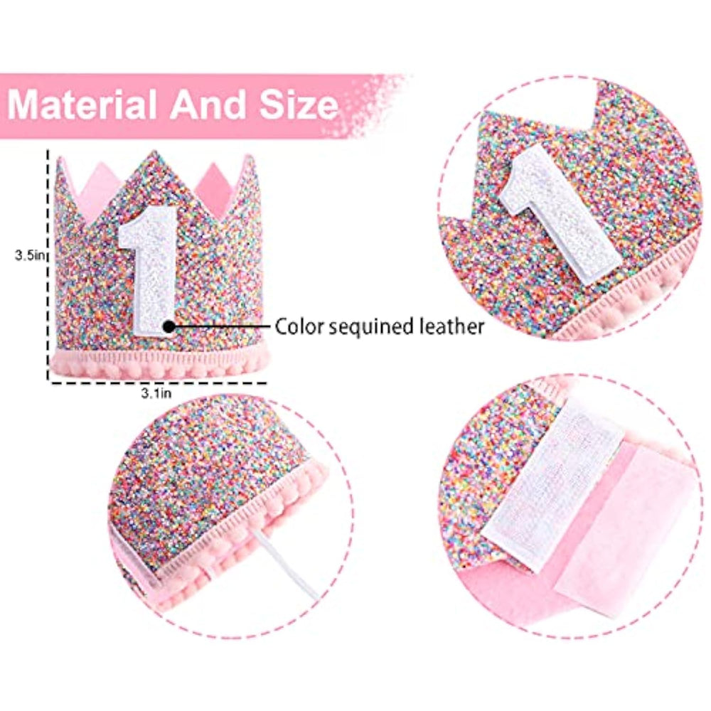 | Exquisite Glitter Crown - Glitter Confetti (Multicolor) Crown With Pink Felt Lining And Pink Pompom Decoration , All Hats Are Made Of Felt Material , With Shiny Surface And Meticulously Designed To Make It Fit The Baby'S Head Perfectly ! The Elastic Strap Can Make It Fit All Baby'S Head Perfectly Without Making Your Baby Feel Uncomfortable | | A Good Moment - Glitter Birthday Crown Are The Perfect Accessory For Birthday Celebrations , Memorable Photo Shoots And Every Day Fun For Dress Up , Birthday Rainbow Girl Crown With Pink Felt Lining, Pink Pompom Trim, Such A Color Combination Can Make Your Child The Focal Point Of This Birthday Party, Which Impresses Their Guests | | Comfortable Size - Our Birthday Party Hat Measures 3.5" From Bottom To Top Of Pom, And 3.1" In Diameter , And Headbands Are Attached To A Comfortable Skinny Elastic , No Need To Assemble Only Elastic Strap Fits Comfortably Under Child'S Chin , Tilt To The Side For A Fun , Whimsical Look ! Make Your Child Look More Naughty And Cute | | Purely Handmade - The Number Of Our Hats Is Limited Because We Make All Of Them By Hand , The Figures Above Are Carefully Glued On By The Workers With Hot Melt Glue, And They Are Not Easy To Fall Off.And The Hats Are Equipped With Velcro Buckle , Easy To Adjust | |
