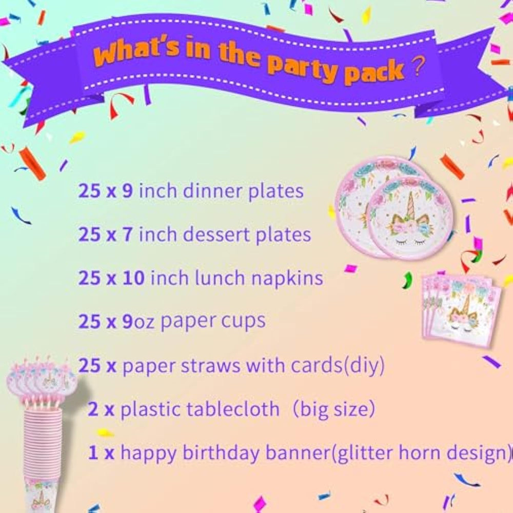 Make your little girl’s birthday magical with this all-in-one Rainbow Unicorn Party Supplies Set for 25 guests! Designed to make party planning stress-free, this complete kit includes dinner and dessert plates, cups, napkins, straws with decorations, a unicorn banner, and two large tablecloths. Made from high-quality, eco-friendly materials, everything is safe, durable, and easy to dispose of. With charming unicorn designs and vibrant colors, it’s the perfect way to create a joyful and unforgettable celebration.
