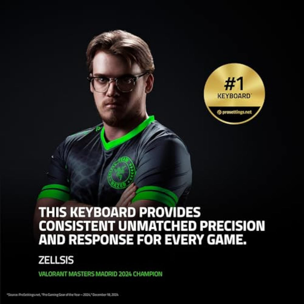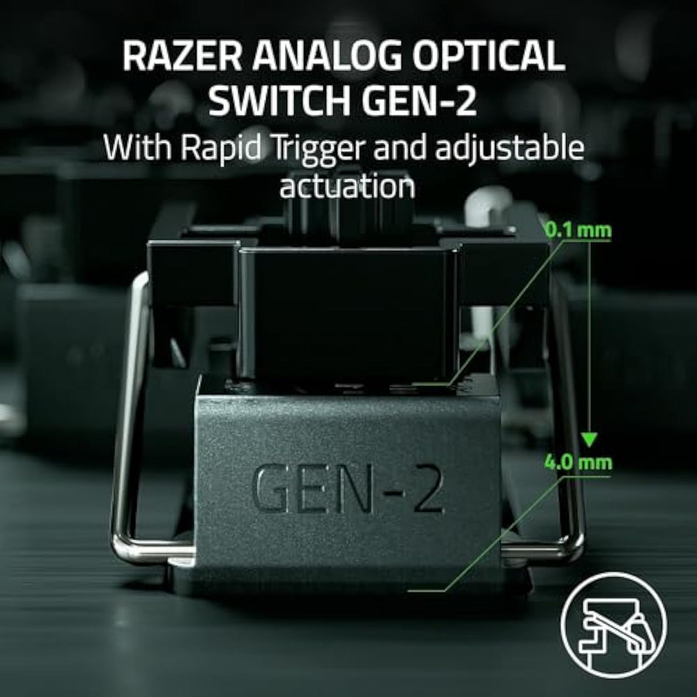 | CHOSEN BY PRO’S FOR ADVANCED FPS MOVEMENT — With Rapid Trigger, Adjustable Actuation and Razer Snap Tap, the Huntsman V3 Pro offers lightning-fast, precise movements that provides gamers an unbeatable edge especially in FPS games | | RAZER SNAP TAP — Prioritize the latest input between two selected keys without having to release the previous one, and enjoy more responsive inputs for near-instant directional changes in FPS games (latest firmware up required) | | RAPID TRIGGER — A step up from traditional mechanical or optical keyboards to achieve the most responsive and precise inputs; reset keys at the slightest lift of a finger, and experience an advantage in speed that is especially useful for movement in competitive FPS games | | ANALOG OPTICAL SWITCHES GEN-2 — Max out on precision and response with advanced switches for ultra fast repeated inputs, a 0.1–4.0 mm adjustable actuation range, and a 100 million keystroke lifespan | | QUICK ONBOARD ADJUSTMENTS — Make precise, on-the-fly adjustments to actuation height or Rapid Trigger sensitivity with the visual aid of an onboard LED array while saving the settings to the keyboard with no software required | |