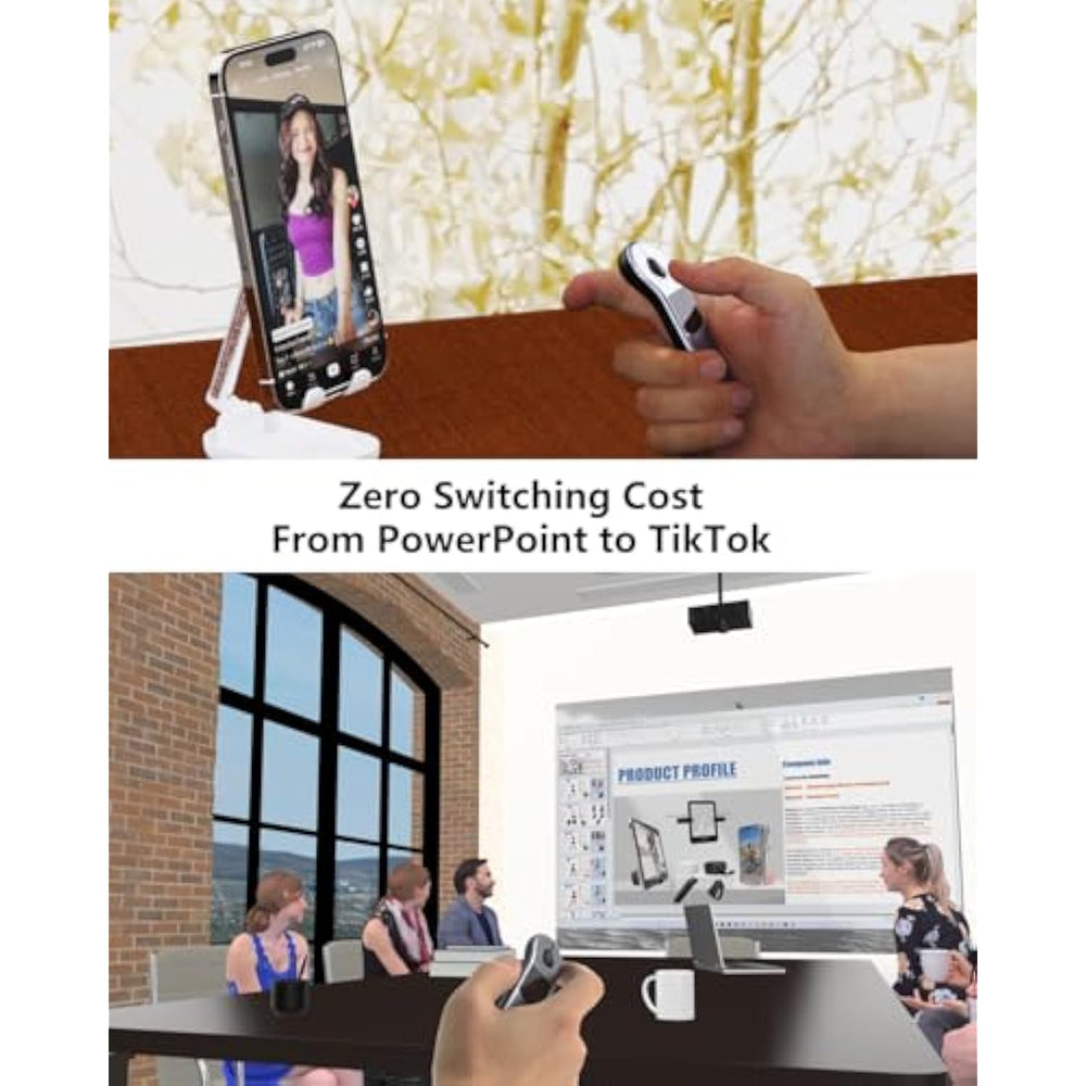 | [Wireless Presentation]This Wireless Presenter Lets You Navigate Slides Smoothly Up To 10 Meters Away, Perfect For Powerpoint And Google Slides | | [Multiple Application Scenarios]Dual-Function Design: Professionally Control Slides While Effortlessly Switching To Tiktok Browsing, Kindle Reading, Or Photo/Video Capture | | [Ergonomic Design For Extended Use]The Featherlight 22.2-Gram Design Combines Anti-Slip Texture And Detachable Wrist Strap To Reduce Fatigue, While Its Universal Hand-Fit Design Ensures Comfort For All Users | | [High Compatibility]Compatible With All Your Devices From Ios And Android Phones To Windows, Macos, And Tablets | | [Battery Life]With A Fast 90-Minute Charging Time And A Lifespan Of 500+ Charge Cycles, This Air Mouse Is Built For Long-Term Reliability | |