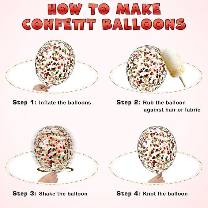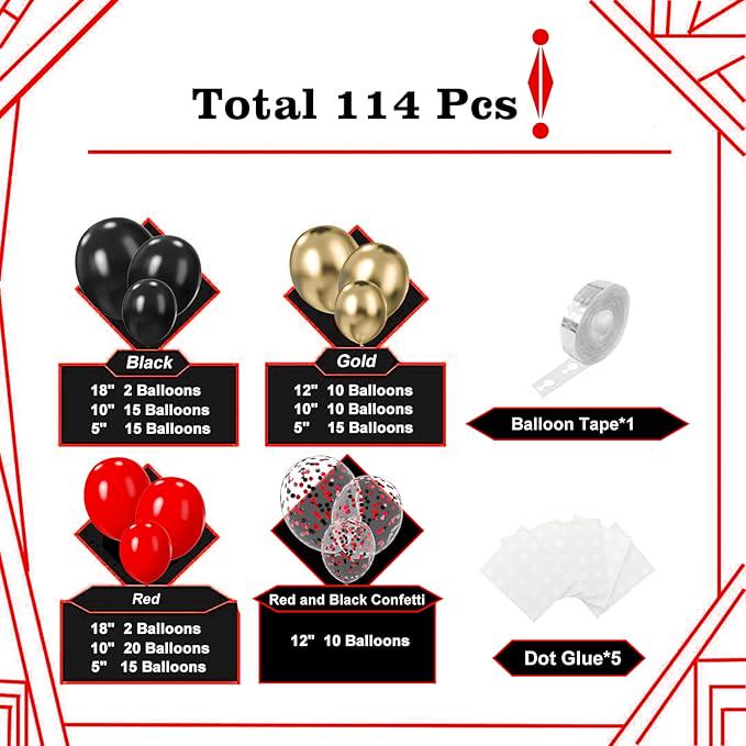 This Red, Black, and Gold Balloon Arch Kit includes 114 latex balloons in various sizes: 4 of 18-inch black and red balloons, 20 of 12-inch gold metallic and confetti balloons, 45 of 10-inch gold metallic, black, and red balloons, and 45 additional gold metallic, black, and red balloons. The kit also comes with a 16-foot balloon garland decorating tape and glue dots for easy assembly. Perfect for creating balloon arches, garlands, wreaths, or table centerpieces, this set adds a festive touch to New Year parties, birthdays, graduations, weddings, anniversaries, bachelorette parties, and themed events like Las Vegas or Buffalo plaid parties. Made from durable, non-toxic latex, the balloons are easy to inflate and assemble. Simply attach the balloons to the tape, secure with glue dots, and arrange on walls, windows, doors, or any party space to create a stunning decoration.