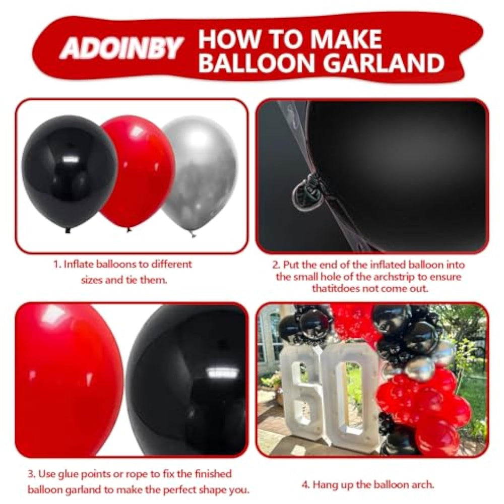 This 140-piece red, black, and silver balloon arch kit includes a variety of balloon sizes along with a 16FT garland strip and 140 glue dots for easy assembly. Made from durable, non-toxic latex, the balloons can be filled with air or helium and are designed to last. With the included tools, creating a professional-looking balloon garland is simple and quick—ideal for busy party planners. Perfect for birthdays, graduations, anniversaries, proms, and more, this bold color combo adds a stylish and festive touch to any event.