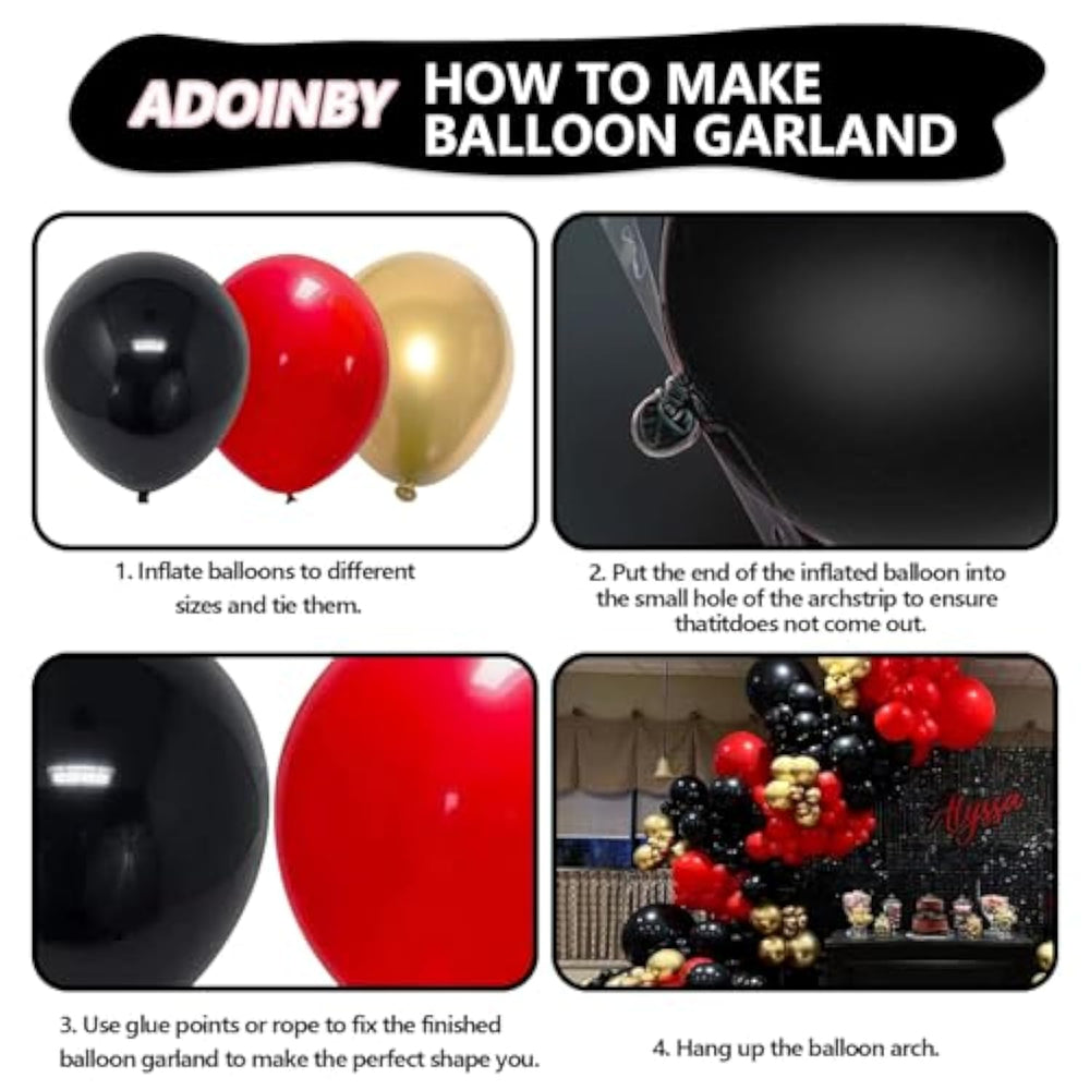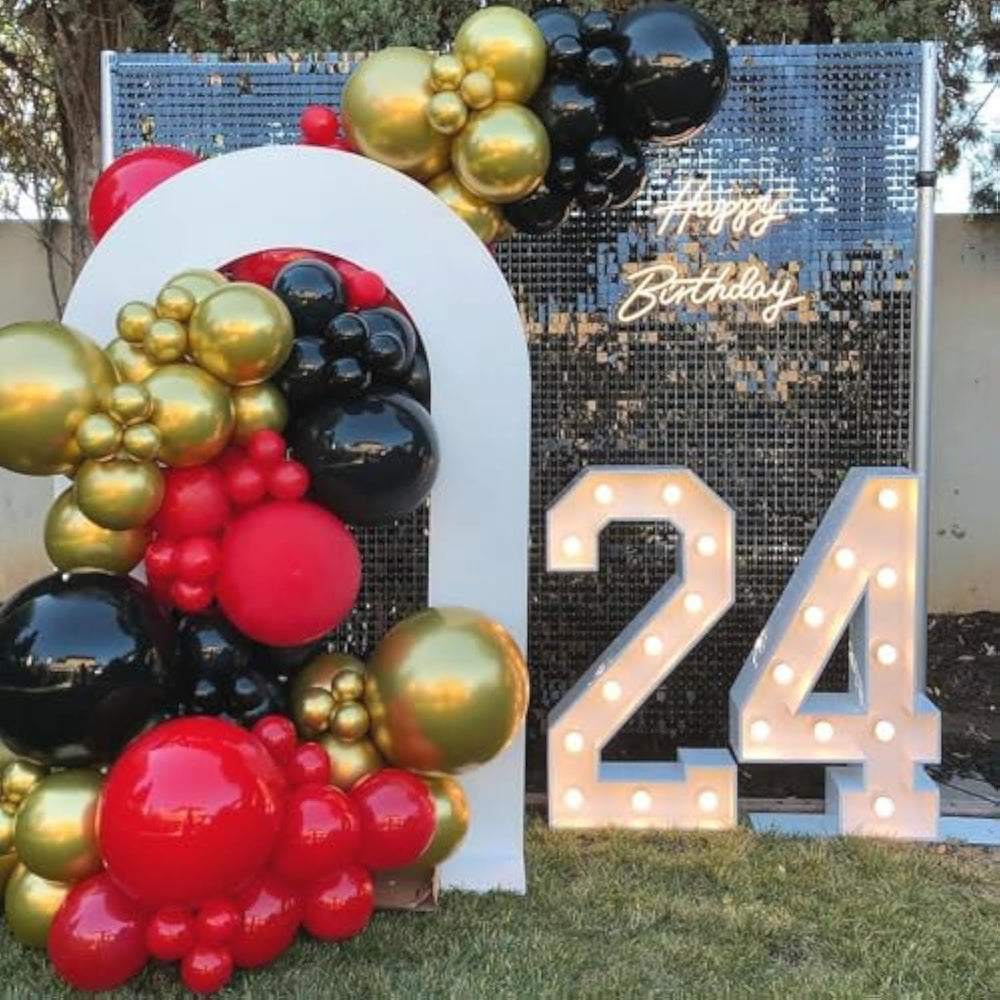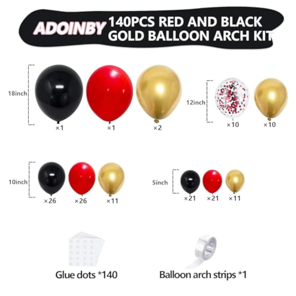Add a bold and elegant touch to any celebration with this 140-piece Red, Black & Gold Balloon Arch Kit. It includes a mix of 5", 10", 12", and 18" balloons in vibrant red, sleek black, metallic gold, and confetti designs, plus a 16ft garland strip and 140 glue dots for easy setup. Made from high-quality, thick latex, these balloons are durable and long-lasting, perfect for air or helium. Whether for birthdays, weddings, graduations, anniversaries, or proms, this kit makes it easy to create a stunning balloon garland or arch for any occasion.