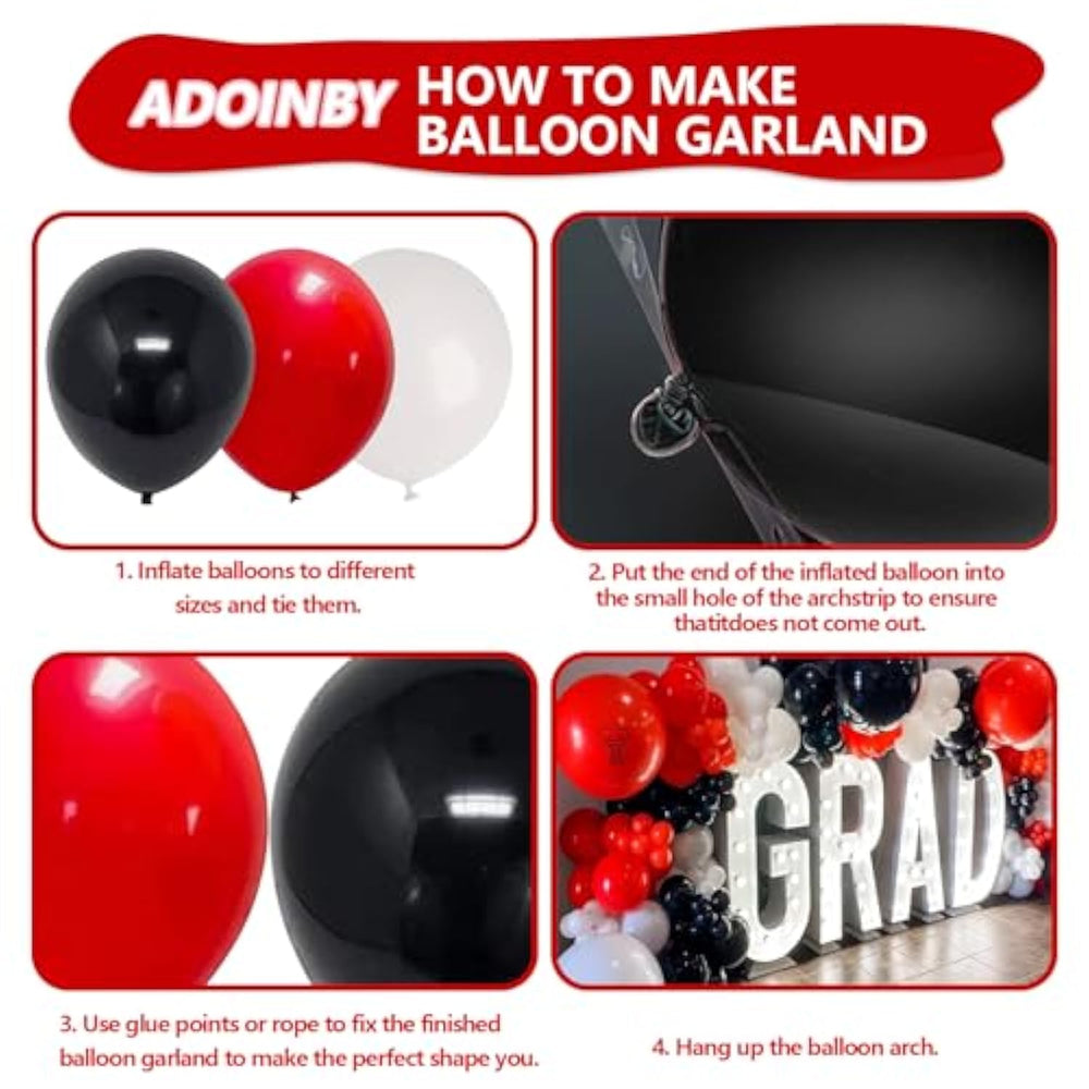 This Red, Black, and White Balloon Garland Arch Kit includes 140 high-quality latex balloons in various sizes, 2 x 18-inch red and black balloons, 10 x 12-inch metallic silver and black-red confetti balloons, 26 x 10-inch red, 26 x 10-inch black, 21 x 10-inch white, and 16 x 5-inch red, 16 x 5-inch black, and 11 x 5-inch white balloons. It also comes with a 16ft garland strip and 140 glue dots for easy assembly. Made of durable, non-toxic latex, these balloons can be filled with air or helium. For the best results, avoid overinflating the balloons (no more than 90%) and keep them away from sharp objects or heat. Assembly is simple—just insert balloon knots into the strip holes and secure them with glue dots. An electric balloon pump is recommended to save time and enjoy the party setup. Perfect for birthday parties, anniversaries, racing car themes, and New Year’s celebrations.