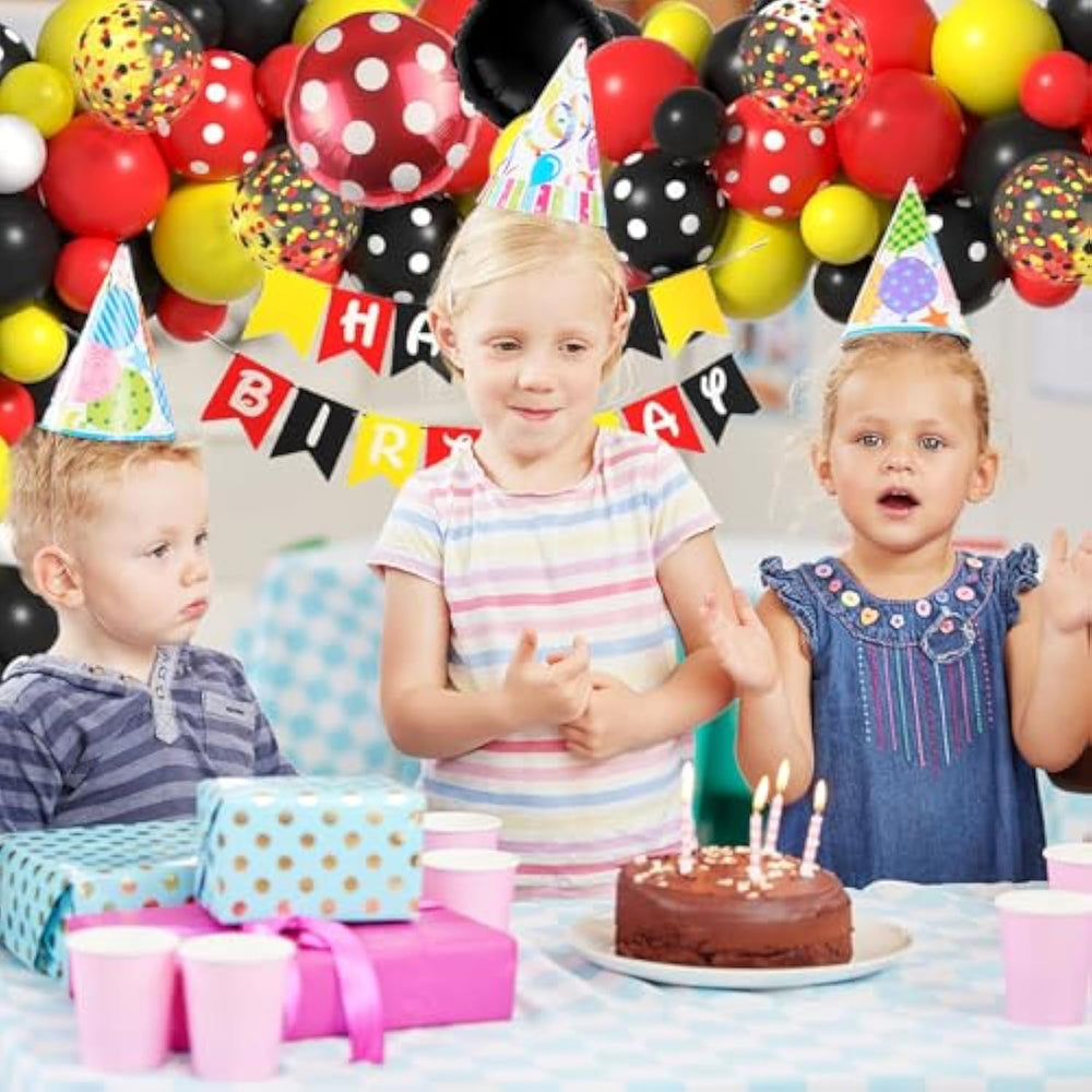 | Black Red Themed Balloons Are Perfect For Children'S Birthday Parties Or Cartoon Mouse Birthday Parties, And Are The Perfect Decoration For Children'S Birthday Parties. It Will Add Some Creativity To The Decorations For Your Child'S Birthday Party. Better Enhance The Party Atmosphere And Hold A Beautiful And Memorable Birthday Party. | | 110Pcs Black, Red And Yellow Balloons,1 Set Birthday Banner,1 Glue Dot And Wreath Strip. Please Refer To The Picture For Specific Color And Quantity. | | No Complicated Steps, Using Glue Point And Garland Strip To Put Balloons Together, You Can Quickly Create A Cartoon Mouse Theme Balloon Arch. | | Made Of High Quality Latex, Bright And Shiny In Color. Durable And Reusable. | | ?Note?Because The Latex Balloon Itself Has Some Pungent Smell, And After A Long Time Of Sealed Transportation, It Will Emit Some Pungent Smell After Opening, Which Is A Normal Phenomenon, Please Put In A Ventilated Place For A Period Of Time, The Smell Can Be Dissipated.Do Not Overinflate, Avoid High Temperatures Or Sharp Objects, Or The Balloon May Burst. | |