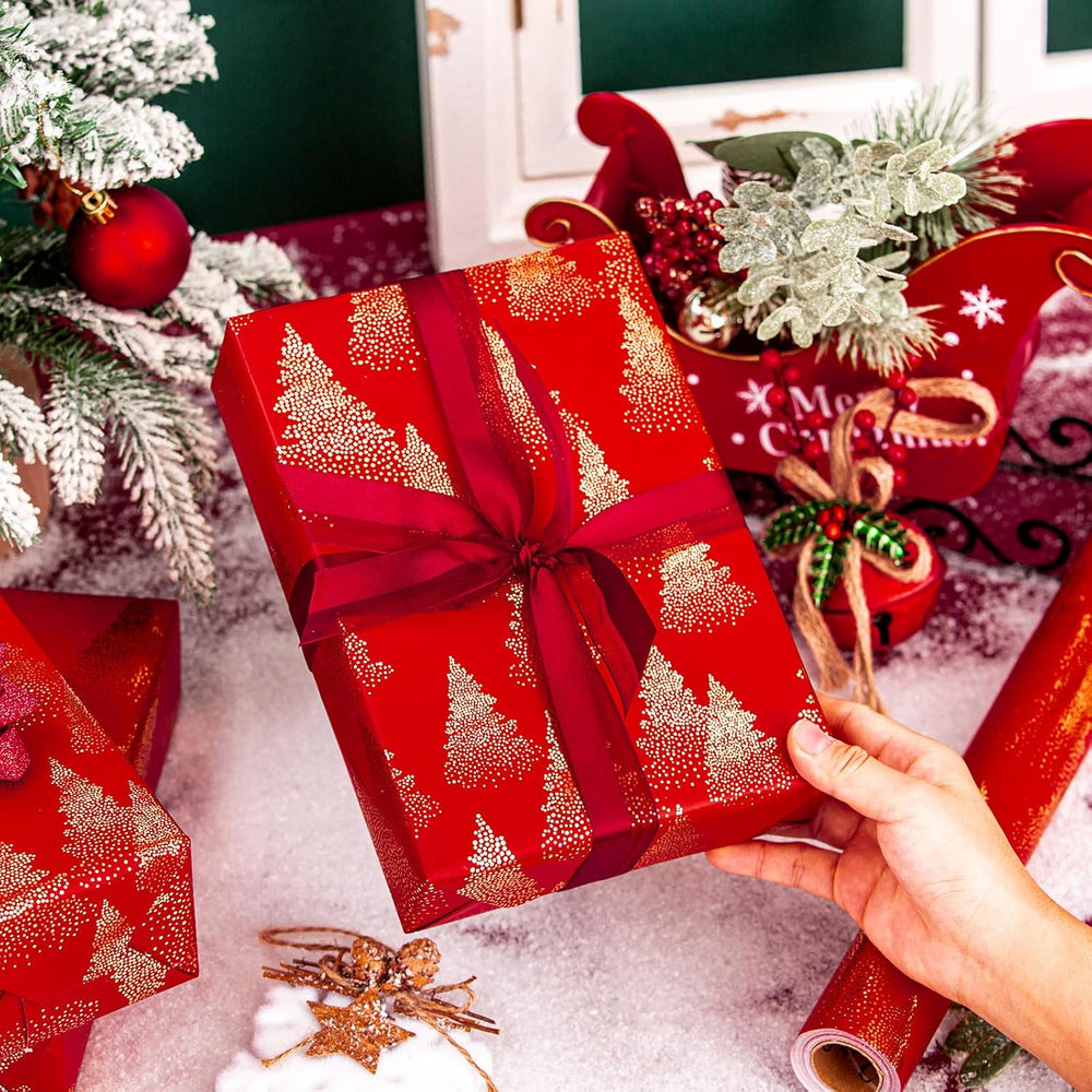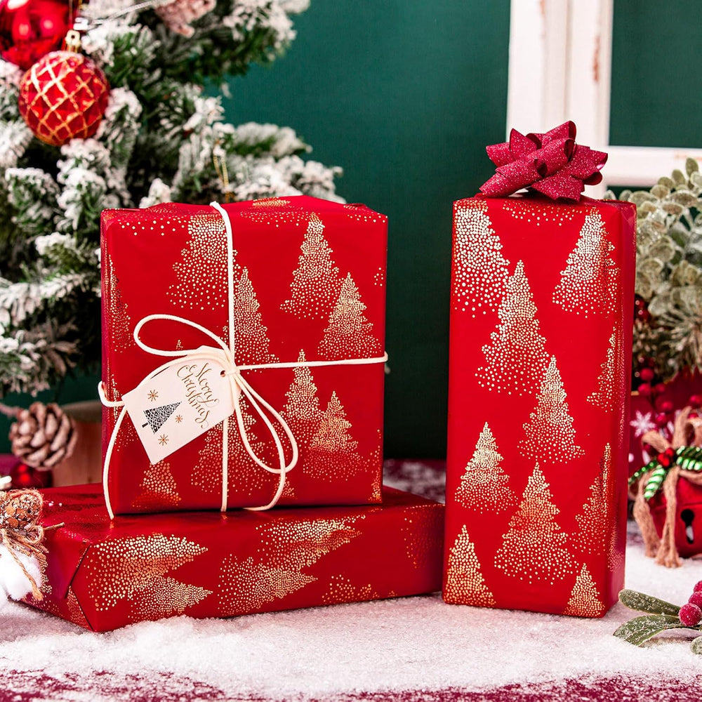 | Shiny Christmas Tree Wrapping Paper: Make Your Gifts Stand Out With This Deep Red Christmas Tree Gift Wrap, Adorned With Luxurious Gold Foil Christmas Trees. The Modern Yet Festive Pattern Brings A Sophisticated Holiday Charm To Your Presents, Making Every Package Feel Extra Special Deep Red Christmas Gift Wrap Paper: Red And Gold Christmas Wrapping Paper, Bring Joy To Every Package, Sprawling At A Vast 17 In X 33 Ft, Provides 46.8 Sq Ft. The Red Holiday Paper Makes Great For Any Small Or Medium Gift. Please Confirm Gift Size Before Placing Order Luxury Gold Foil Wrapping Paper: Crafted From High-Quality Gold Foil, This Red Gold Wrapping Paper Doesn’T Just Look Stunning—It Feels Premium Too. The Smooth, Durable Material Is Tear-Resistant And Easy To Fold, Ensuring Crisp. Design Cutline On Reverse For Easy To Use Any Holiday Celebration Crafting: This Christmas Gift Supplies Essential Is More Than Just Wrapping Paper—It’S Perfect For Diy Holiday Decorations, Crafting Projects, Scrapbooking, And Festive Table Settings.Whether You’Re Wrapping Presents For Christmas Morning Or Adding A Seasonal Touch To Your Home, Brings Warmth And Elegance To Any Holiday Occasion A Must-Have For The Season: Stand Out From Traditional Gift Wrap With Red Wrapping Paper! Whether Crafting With Kids Or Decorating For A Christmas Party, This Christmas Wrapping Paper Brings Festive Charm To Every Corner Of Your Home