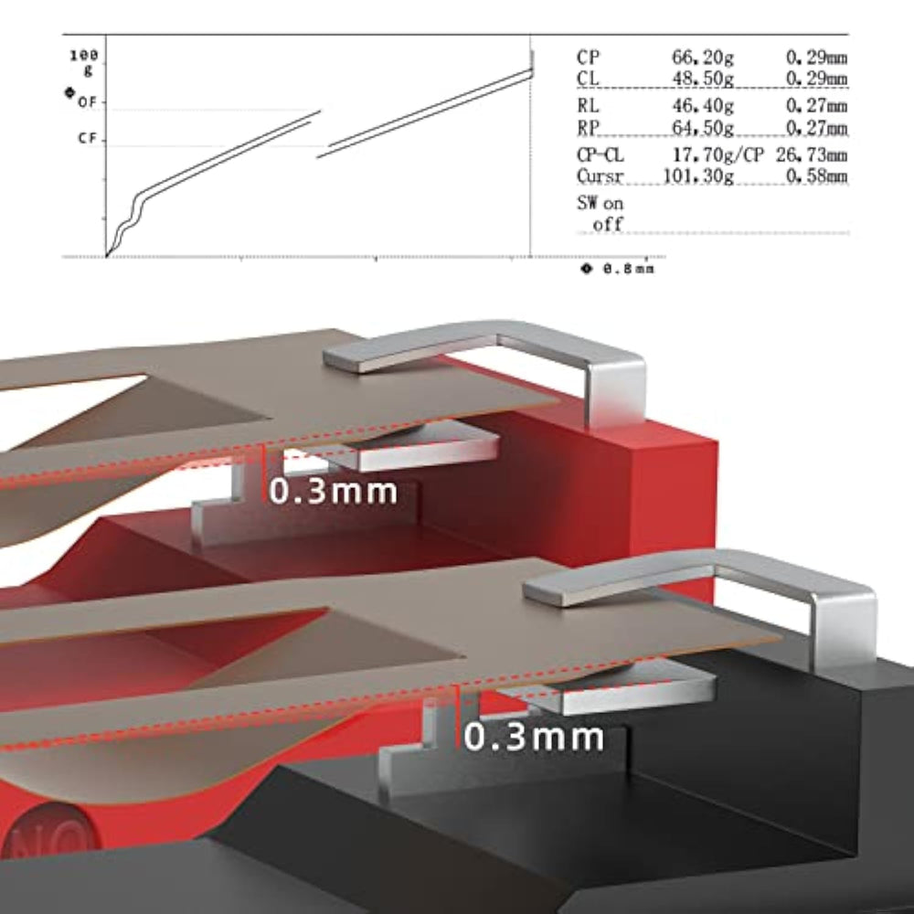 | ?Red Gm4.0 Parametric?Releg Force 25Gf(Min), Operating Force 70±10Gf, Conduction Itinerary 0.3Mm, Touch Feeling 25%. Not Silent Micro Switch.No Double Click. | | ?Black Gm8.0 Parametric?Releg Force 25Gf(Min), Operating Force 65±10Gf, Conduction Itinerary 0.3±0.2Mm, Touch Feeling 25%. Not Silent Micro Switch.No Double Click. | | ?Times?We Have Matched Gm4.0 And Gm8.0 Suits According To The Needs Of Players.Gm8.0 Over 80000000 Cycles, Gm4.0 Over 60000000 Cycles.Both Are Gold Plated