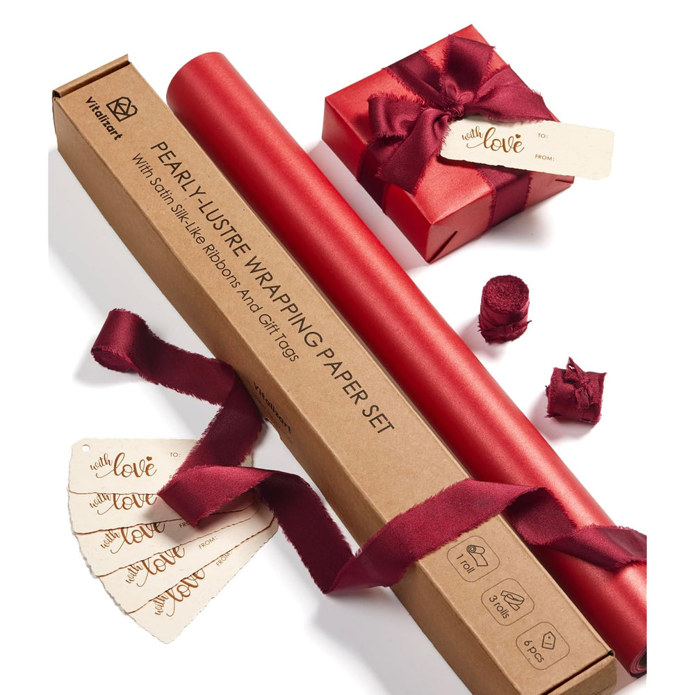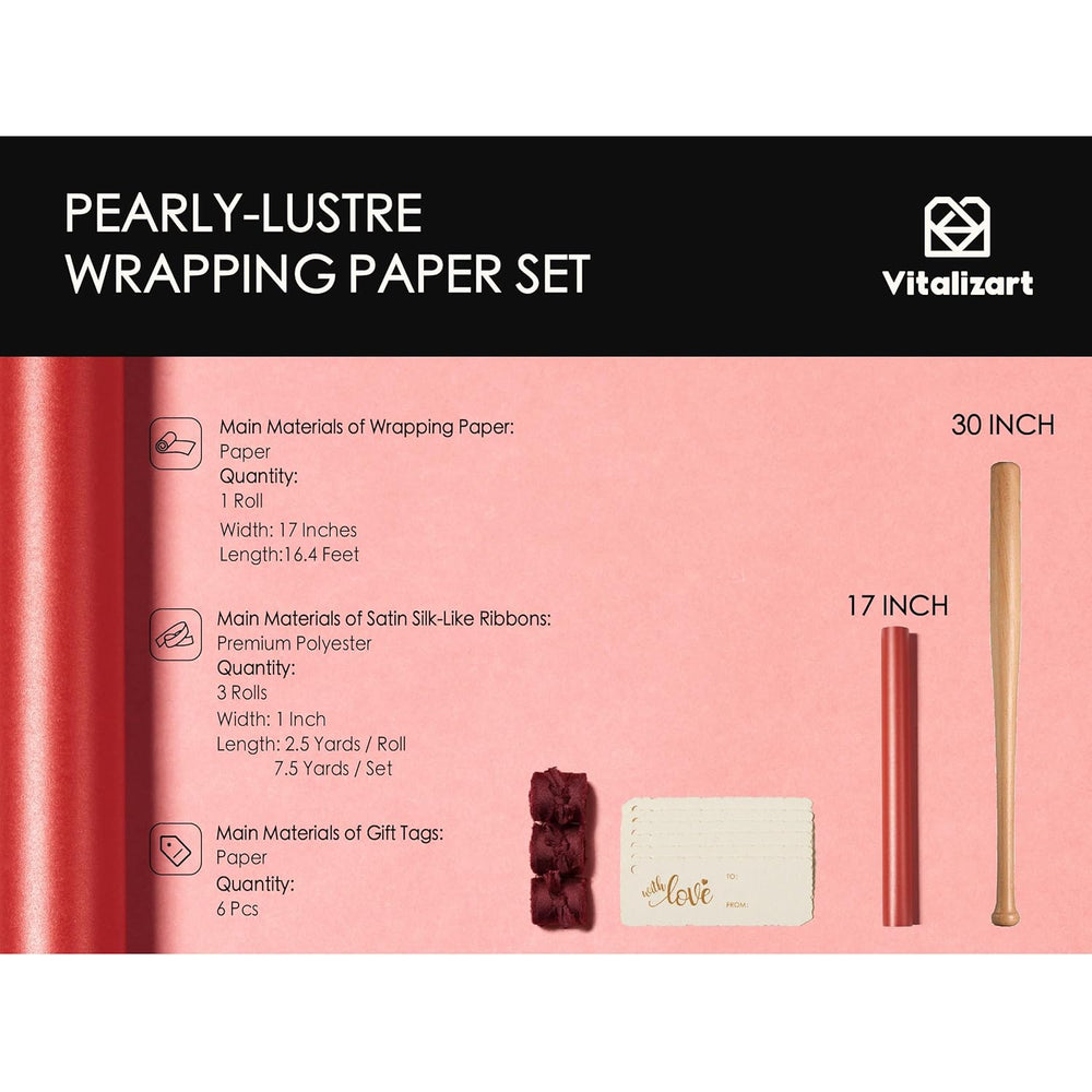 | Easy-Peasy Gift Wrapping: Each Package Has 1 Paper Roll (17"X197"), 3 Silk Like Satin Ribbons And 6 Gift Tags. Get All Wrapping Supplies At Single Purchase To Make An Impressive Gift. All Materials Are Safe To Use And Have No Chemical Smell. Make It "The Gift You Specially Prepare" For Beloved Ones: The Semi-Personalized Gift Tags Provide A Simple Way To Customize Your Gift And Express Your Appreciations To Family And Friends. Recyclable Safe: The Pearlescent Texture Comes From Water-Based Ink Jet Printing, Making Our Wrapping Paper Safe To Use. Premium Quality For Versatile Uses: Proper Thickness And High Durability Make It Much Easier To Be Folded Without Tearing Or Ripping. Solid Color With Metallic Lustre Sheen Perfectly Match With Many Occasions Including Christmas, Valentine'S Day, Thanksgiving, Weddings, Bridal Showers, Birthday Party, Welcome Baby Shower And Handmade Crafts. Small Roll Less Waste: Compared To 30", The Size Of 17" Width Paper Is Pre-Calculated Specially In Order To Cause Less Waste And Avoid Excessive Packaging. The Paper Is Easy To Cut And Tape To Fit Various Sizes Of Gifts.