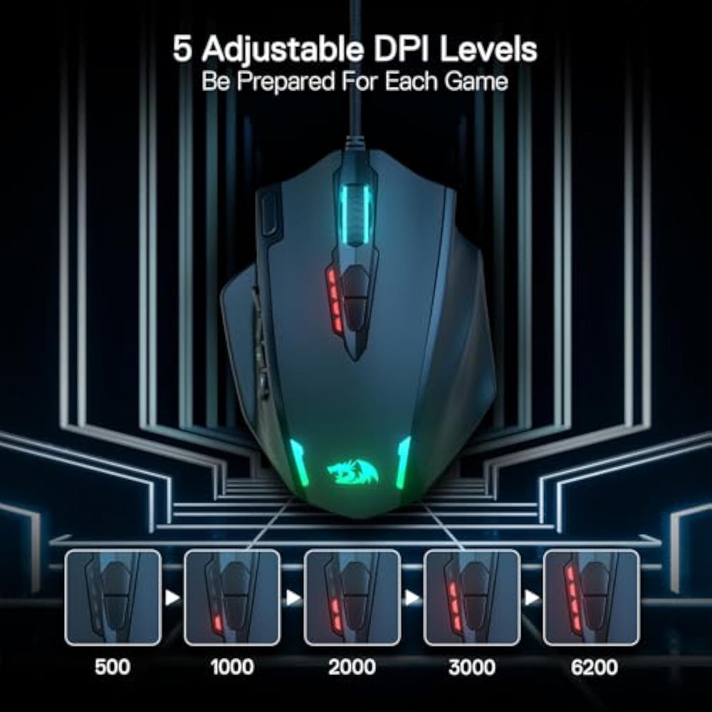 | Professional Gaming Mouse - Redragon M908 optical gaming mouse is designed with up to 12400 DPI, 5 adjustable DPI levels (500/1000/2000/3000/6200 DPI) meet your multiple needs, either for daily work or gaming. DPI can be adjusted freely by ±100 from 200 to 12400 via software. 1000 Hz polling rate, 30G acceleration and high-precision Pixart PAW3327 Sensor giving you a greater edge over your competition. | | RGB Backlight Programmable Buttons - 16.8 million RGB LED color options (LED Backlight can be disabled). 18 programmable buttons, 5 memory profiles each with a dedicated light color for quick identification. Comes with 8-piece weight tuning set (2.4g x8), easy to change the weight to suit your games. | | Comfort Precision At Your Hands - Redragon M908 gaming mouse is an essential computer accessory for die-hard with its aggressive design for hands! You will be amazed by the unmatched comfort, lethal accuracy and killer precision of our durable, desktop and laptop pro gaming mouse! | | High-end Design - Redragon M908 Mouse features 8 buttons and 12 MMO programmable side buttons. Durable smooth TEFLON feet pads for ultimate gaming control. 6ft braided-fiber cable with gold-plated USB connector ensures greater durability. | | Die-hard Players Choice - Whether you are targeting, aiming, slashing or attacking, a professional gaming mouse is your basic weapon! The mouse will be your ideal partner. Compatible with Windows 2000/ME/XP/03/VISTA/7/8/10 system for programmable using and Mac OS for normal using. | |