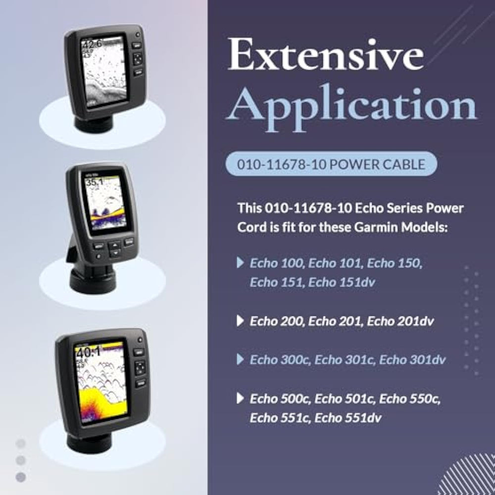 ?Wide Application?This Echo Series Power Cord Is Compatible With Garmin Modelsâ—Echo 100, Echo 101, Echo 150, Echo 151, Echo 151Dv, Echo 200, Echo 201, Echo 201Dv, Echo 300C, Echo 301C, Echo 301Dv, Echo 500C, Echo 501C, Echo 550C, Echo 551C, Echo 551Dv. | | ?Great Feature?This Power Cord Is Designed To Power Your Echo Series Fish Finder Efficiently. On An Echo 100/150/300C Series Device, The Connectors On The Cables Are Keyed To Fit Only In The Correct Ports On The Device. On An Echo 200/500C/550C Series Device, The Connectors On The Cables Are Keyed To Fit Only In The Correct Ports On The Cradle. The Connected Cables Are Then Held In Place By A Locking Bracket. | | ?Easy Wiring?(1) Route The Power Cable From The Swivel Mount To The Boat Battery Or Fuse Block. (2) Connect The Red Wire To The Positive Terminal On The Battery Or Fuse Block, And Connect The Black Wire To The Negative Terminal. | | ?Superior Material?The Power Cord Is Made Of Highly.