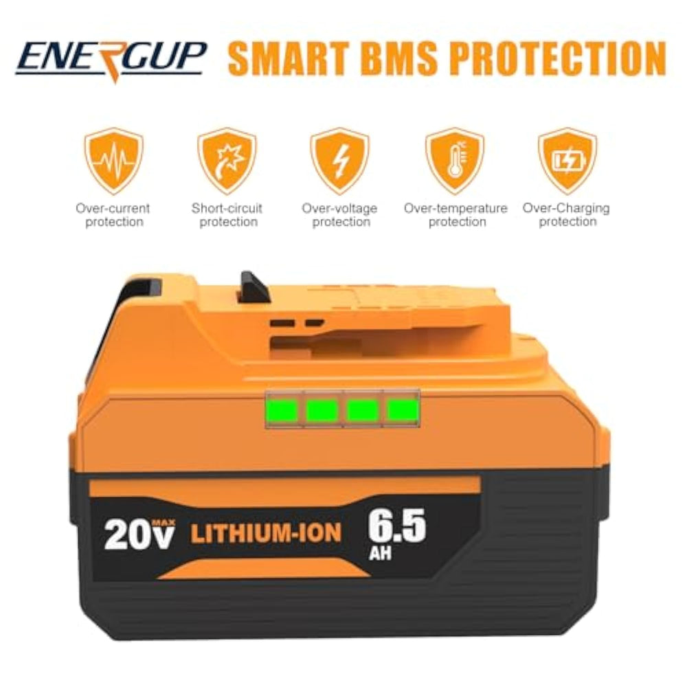 ??Package Includes?Package Includes: 2 X 6.5 Ah Replacement For Dewalt 20V Battery, 1 X Replacement For Dewalt Battery Charger. | | ??Widely Compatibility?Compatible With Dewalt 20V Max Xr Battery, Such As Dcd/Dcf/Dcg/Dcs Series, Dcb203, Dcb204, Dcb201, Dcb206, Dcb205-2, Dcb200-2, Dcb200 Dcb180, Dcb204-2, Etc. (20 Volt Replacement For Dewalt Batteries And Charger. Not The Original | | ??Battery Advantage?1. Power Indicator Added To Help You Finish Your Work More Wisely. 2. No Memory Effect. Can Be Charged Or Discharged As Needed Without Loss Of Capacity. 3. Stands With Ce-/Fcc-/Rohs Certified For Safety. The Shell Is Made Of A0-Class Fireproof Material, Effectively Eliminating The Risk Of Fire. 4. Build-In Intelligent Chip To Provide All-Around Protection Against Over-Charge, Short-Circuit, Over-Heat, Over-Load, And Low-Voltage | | ??Charger Specification?Us Standard Plug 110V To 240V Voltage Input, Dc Output 10.8V-20V/3A Max, Charge Batteries In A Fast And Highly Efficient W.