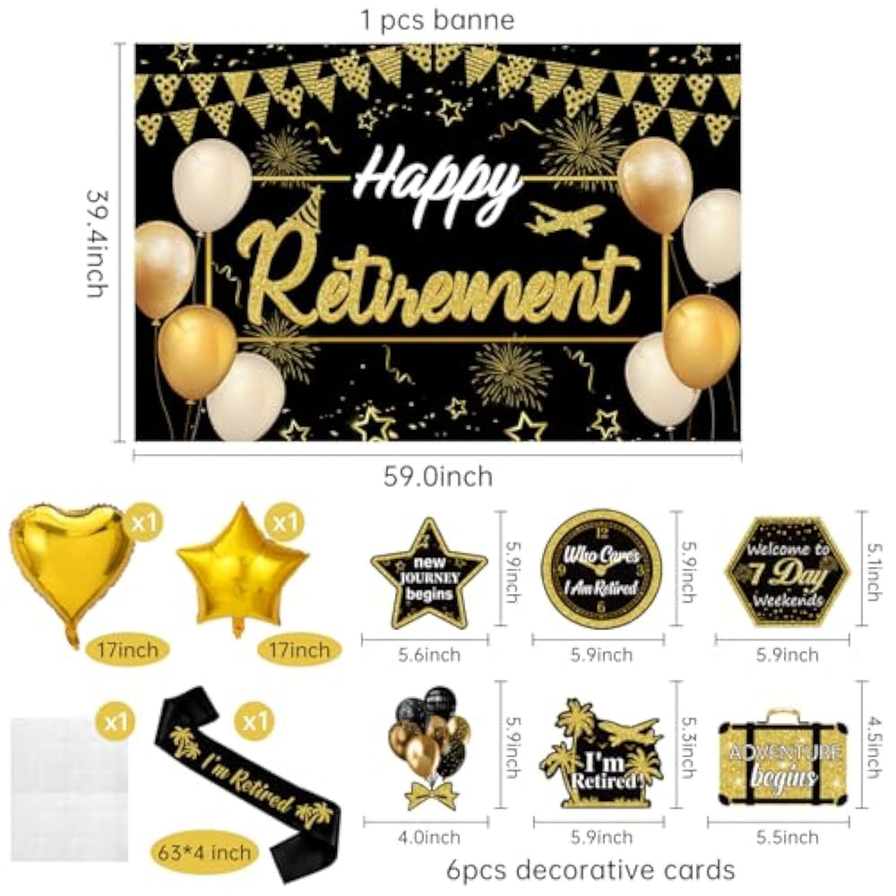 | You Will Receive?Retirement Party Decorations Kit, 1 × Happy Retirement Banner, 1 × Happy Retirement Backdrop, 1 × Black Retired Sash, 6 × Handling Swirls, 4 × Honeycomb Centerpieces, 6 × Decorations Stickers, 2 × Foil Balloons. This Set Is Enough To Decorate Your Retirement Party | | Retirement Decorations?We Have Put Together The Whole Set To Help You Save Time And Meet Your Needs, This Set Is Enough To Decorate Your Retirement Party. Classic Black Gold Design, Rich Retirement Theme Elements, This Will Be A Great Retirement Theme Party Complement To Create Good Memories For Retirees | | Application?Ideal For Retirement Parties With Various Themes, It Can Be Used Both Indoors And Outdoors To Create A Warm Atmosphere For Your Party. It'S Also Perfect For Taking Photos | | Easy To Assemble?Retirement Party Decorations Are Very Easy To Assemble. Retirement Banners, Posters, And Hanging Swirls All Have Pre-Cut Holes That You Can Easily String Together To Decorate. Honeycomb, Simply Peel Off The Sticker And Rotate The Base 360 Degrees. Decorative Cards Can Be Decorated With A Good Adhesive. This Set Won'T Take You Much Time To Decorate The Party Scene | | Well-Made Materials?Made Of High-Quality Polyester Fabric, Aluminum Foil And Thick Cardstock, These Ornaments Are Lightweight, Durable, Legible And Reusable | |