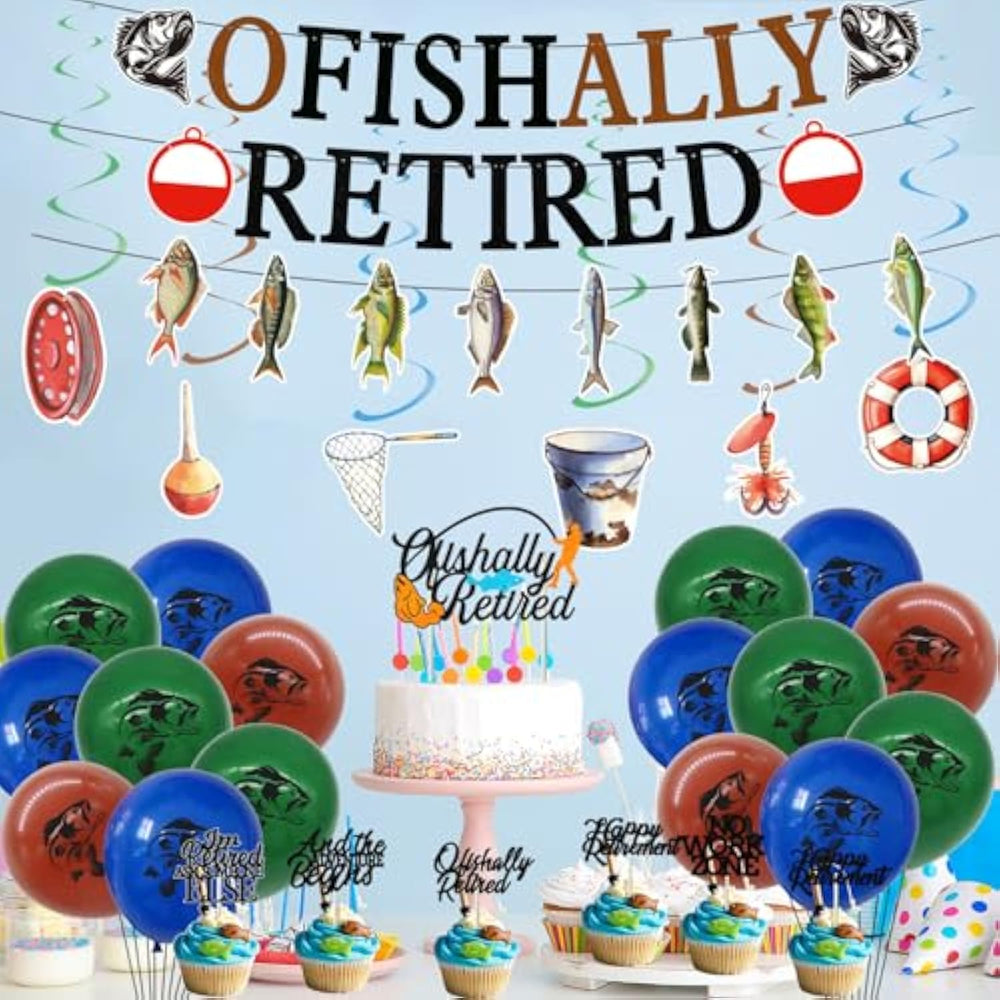 | [Fishing Retirement] - Our Fishing Retirement Party Decorating Set Includes 1Pc Glitter "Ofishally Retired" Banner, 1Pc Fish Banner, 18Pcs Latex Balloons, 1Pc Cake Topper, 6Pcs Cupcake Toppers And 6Pcs Hanging Swirls. Enough Quantity To Meet Your Retirement Party Decorating Needs And Perfectly Decorate Your Retirement Party | | [Large Retirement Background] - The Ofishally Retired Banner Needs To Be Assembled By Yourself And Can Be Spaced Any Way You Want, Hang Them On The Wall, Door Or Anywhere With Balloons, Hanging Swirls To Form A Beautiful Backdrop For The Perfect Photo Shoot. Take Some Beautiful Photos Of This Special Day And Make Deep And Cherished Memories | | [Widely Used] - Perfect For Retirement Party, Office Retired Party, Fishing Themd Retirement Party Or Home Party. Decorate Your Home,Office, Or Outdoors On This Special Day, Create A Wonderful Atmosphere, And Have A Happy And Memorable Day | | [As Retirement Gift] - Our Fishing Retirement Decor Kit Is The Best Retirement Gift For Coworkers Friends And Family. Give It As A Gift To Her/Him Or To Yourself And Create A Surprise For A Great Day | | [Durable Material] - Our Retirement Party Kit Is Made Of High Quality Material, Sturdy, Lightweight And Easy To Carry; The Text Pattern Is Clearly Printed And Easy To Read, Making It A Very Fun Retirement Decoration Kit | |