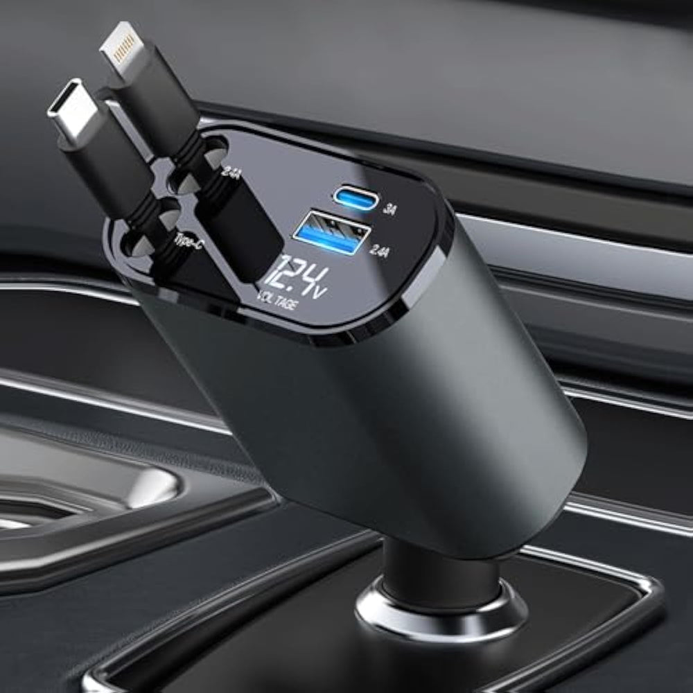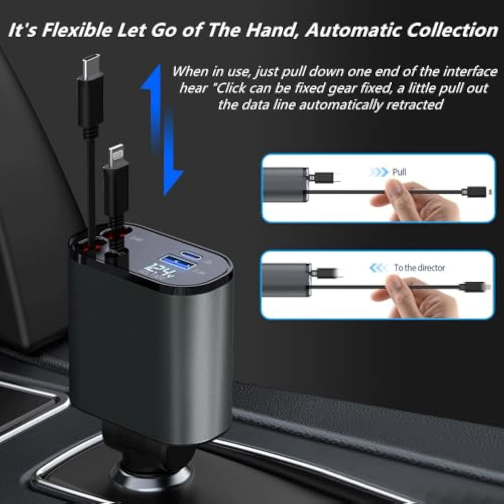 ?4 In 1 Retractable Car Charger,Include 2 Retractable Cables , As Well As 1 Usb-A And 1 Usb-C Port .Simultaneous Fast Charging Of Up To 4 Devices. Compatible For Ios Android Cell Phones All Device Charging. | | ?The Car Usb Charger Provides Extensive Compatibility With Various Vehicle Types Is Designed For Mainstream 12V-24V Cars,Rated Power: 60W,Securely Plugging In And Remaining Stable Even On Bumpy Roads. | | ?Retractable Car Charger Compatible With A Wide Range Of Devices That Support Pd, Qc3.0, Afc, Mtk, And Fcp Charging Protocols.As Phones, Tablets, Gps Units, Notebooks, Switch, Etc. | | ?Car Charger Extends The Cable Up To 80Cm/31.5In,Allowing For Easy Storage And Keeping Your Car Interior Clean And Organized. Can Rotate At Any Angle, Charging Head Can Rotate At Any Angle, Providing A Comfortable And Personalized Charging Experience. | | ?This Car Charger Is An Excellent Gift Choice For Anyone Close To You On Example Their Birthday, Christmas Or Any Other Suitable Occas.