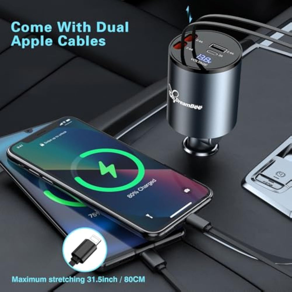 ???Built-In 2 Retractable Charging Cables? Car Charger Comes With Dual Type-C Cables, Free Retractable Up To 31.5Inch, Easy Charging In The Back Seat, Free From Forgetting To Bring The Charging Cable, Keep The Car Neat And Tidy. | | ???Upgraded Super Fast Car Charger?Maximum Power 68W, The Charger Also Has A Usb-C Port And Usb Port, Which Can Safely Charge Up To Four Devices At The Same Time, Ordinary Car Chargers Are 5 Times Faster, No Need To Wait When You Are In A Hurry To Charge Instantly. | | ??Smart Chips And High-End Materials?High Quality Chip With Over-Current And Short-Circuit Protection, Charging Without Burning Or Damaging Your Device. The Shell Is Made Of Material Made Of Aluminum + Abs, Very Hard And Durable! Note: Only When The Car Is Started Will The Car Charger Be Energized, After The Car Is Turned Off, Even If The Car Charger Is Still Plugged Into The Cigarette Lighter, It Will Not Draw Power From The Car Battery, Which Can Perfectly Protect Your Car Battery..