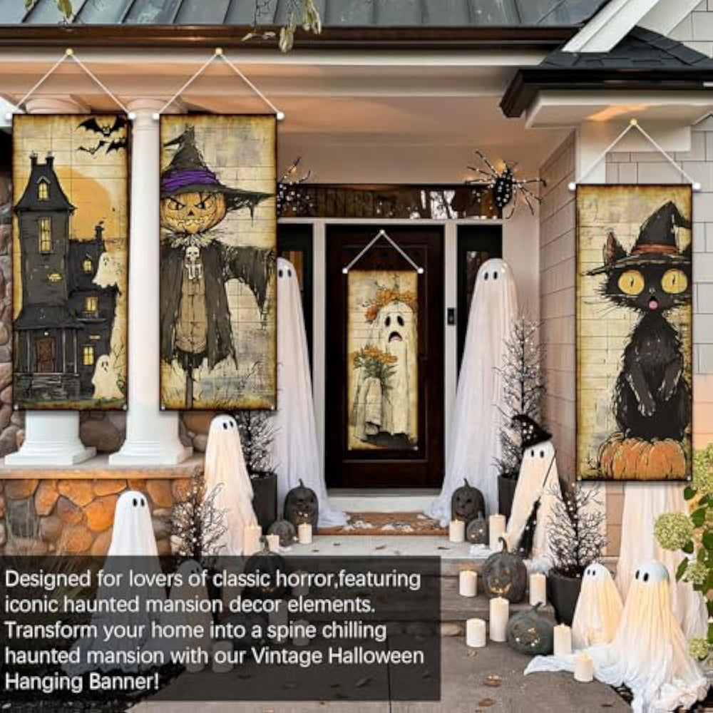 Halloween Haunted Mansion Banner Set – Transform your space into a spooky, vintage Halloween scene with this 4-piece banner set featuring classic haunted mansion motifs, including ghosts, skulls, tombstones, and black cats. Each banner measures 15.7" x 40" (40 x 102 cm) and is crafted from waterproof vinyl for all-weather durability, resisting rain, wind, and UV rays while keeping colors vivid and details sharp. Easy to hang with included ropes—no tools required—perfect for walls, fences, porches, gardens, or entryways. Ideal for Halloween parties, haunted house setups, or adding a retro, eerie touch to your indoor or outdoor decorations.