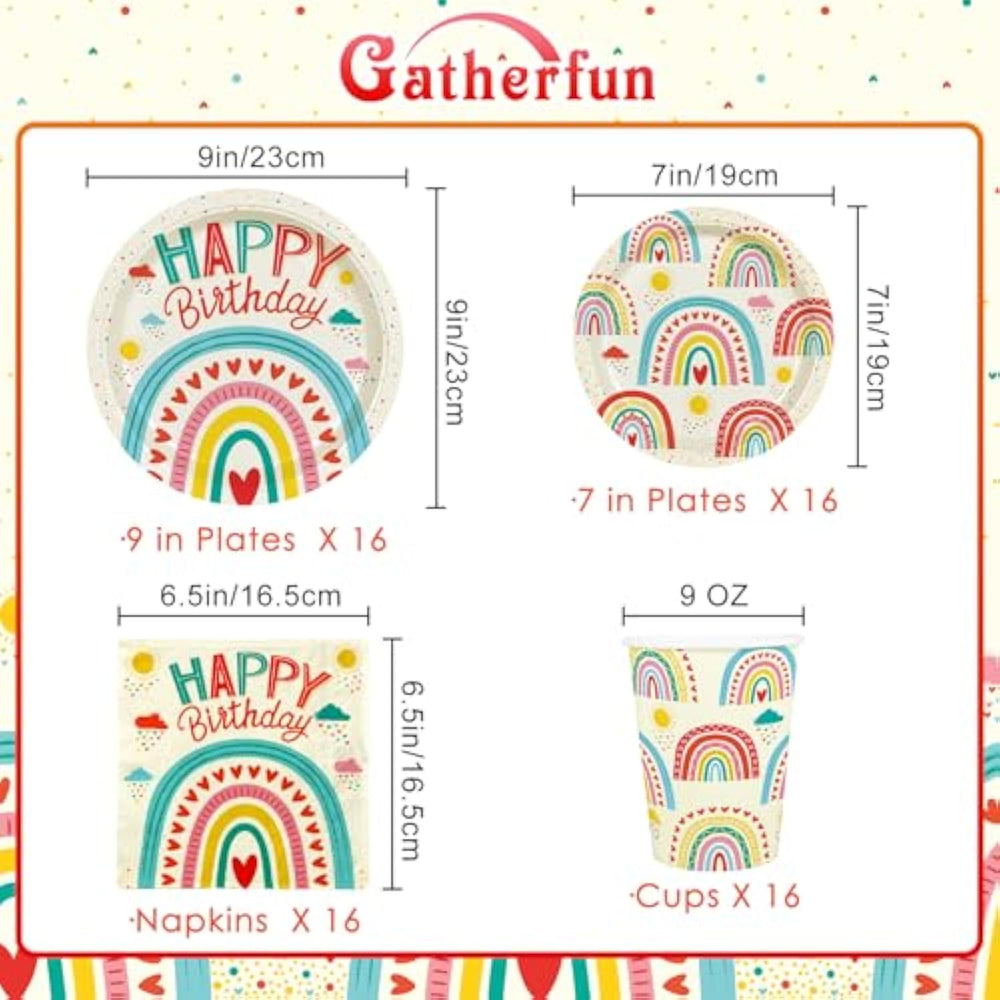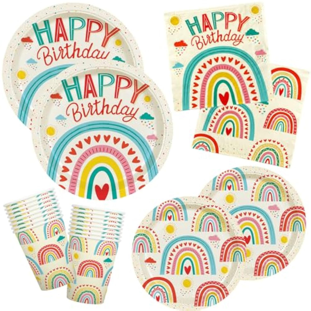 Complete Birthday Set: A Comprehensive Birthday Party Pack Including 16Pcs Of 9" Happy Birthday Plates, 16Pcs Of 7" Paper Plates, 16Pcs 6.5" * 6.5" Paper Napkins, 16Pcs 9Oz Paper Cups. All Your Birthday Party Supply Needs. | Color-Boosting Celebration: Add More Zest To The Birthday Bash With This Lively Tableware. Boasting Rainbow, Sun Patterns And A Vibrant "Happy Birthday" Headline, All Against A Fresh White Background. | Vibrant Paper Plates: Simple Yet Colorful Paper Plates Featuring Rainbow Illustration Amidst A Subtle Rain Cloud Background. They Are The Size For A Quick Meal To Fuel A Fun-Filled Day. | Eco-Friendly Durable Partyware?Those Disposable Paper Plates, Napkins, Cups Are All Printed With Food Grade Water-Based Inks,Suitable For Food