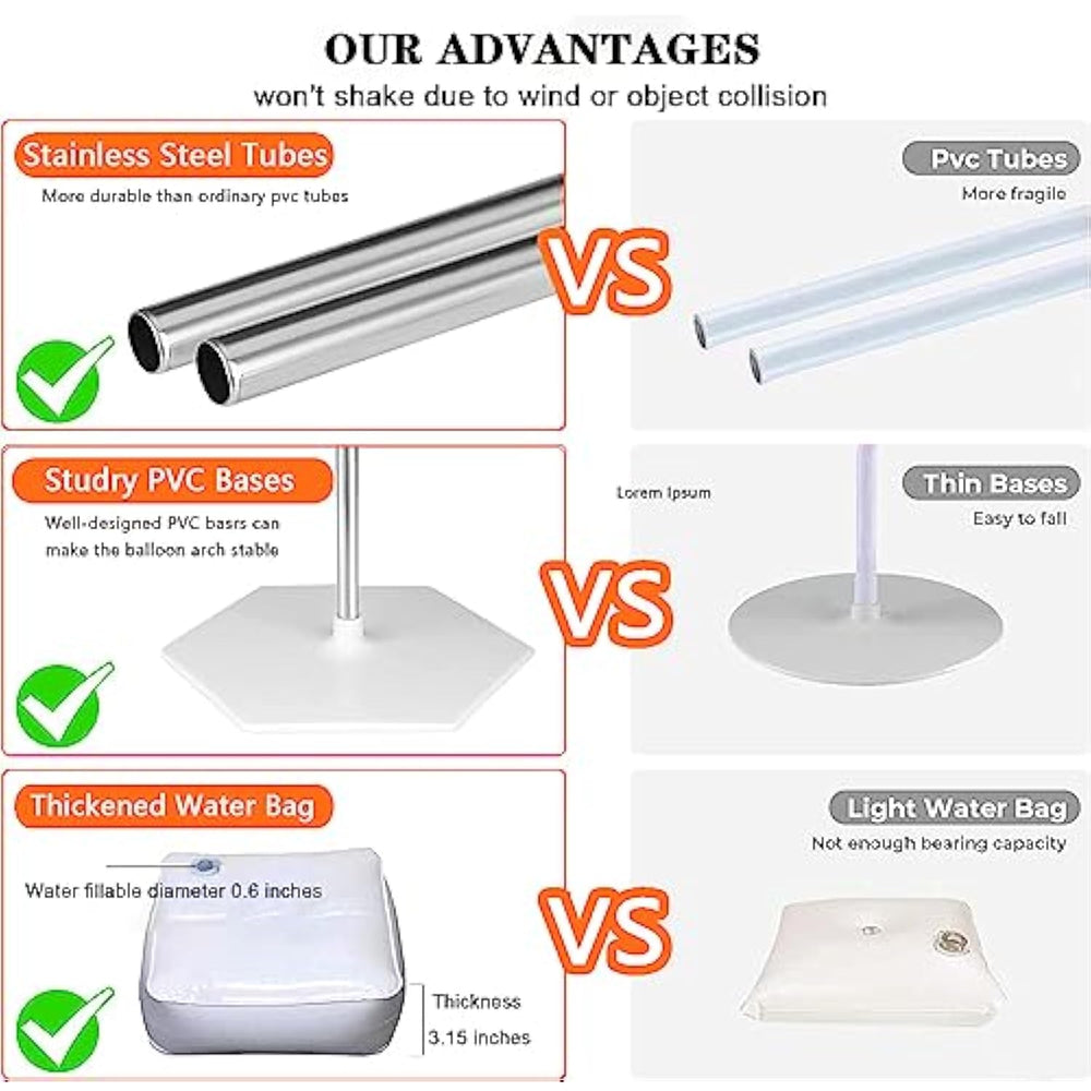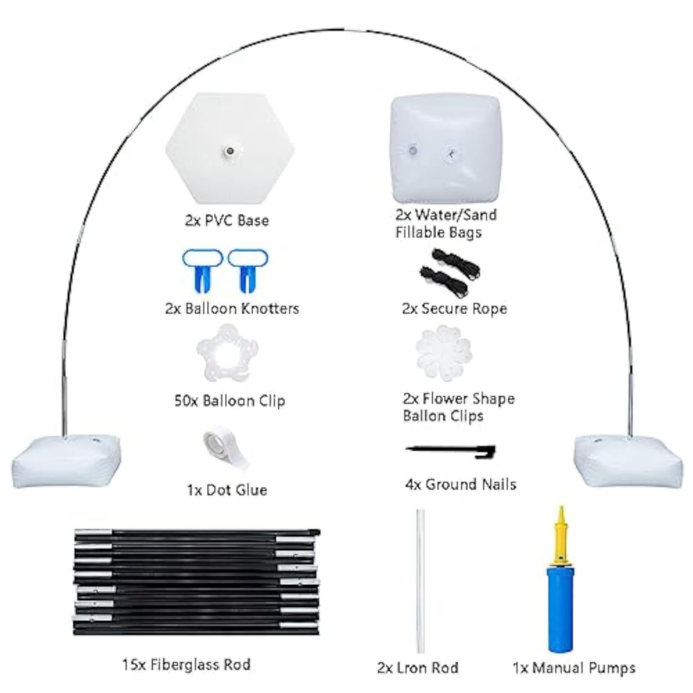 Adjustable Height And Width: The Balloon Arch Stand Kit Allows For Quick Assembly And Disassembly, With An Adjustable Range Of 2M-3M. The Height And Width Of The Arch Can Be Adjusted At Will By Adjusting The Distance Between The Bases. | Durable Materials: The Balloon Arch Stand Is Made Of Durable Pvc And High Strength Black Fibreglass Poles With 2 Water Bags To Keep The Arch Stand Stable. The Materials Are Reusable And Suitable For Both Indoor And Outdoor Events. | Versatile Occasion Decor: The Balloon Arch Stand Kit Is Suitable For Many Occasions Including Parties, Weddings, Birthdays, Christmas, Baby Showers, Graduations, Anniversaries, Thanksgiving Day, And New Year'S Celebrations. It Can Be Used To Creatively Decorate Your Party With Different Balloons. | Safe And Easy To Use: The Balloon Arch Stand Kit Is Tested To Be Safe And Easy To Assemble And Disassemble. It Includes 83 Accessories And Instructions In English For Quick Setup. | 100% Risk-Free Satisfaction : If You Have Any Questions Or Are Not Satisfied With The Balloon Arch Stand Kit, We Provide A 100% Risk-Free Satisfaction . Order Today With Confidence. |