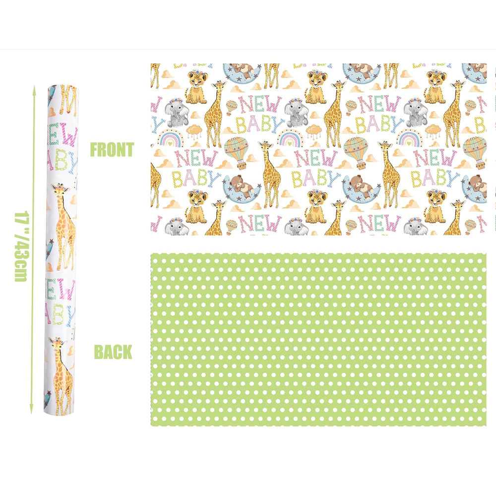 | Perfect Size: Each Roll Measures 17 Inches Wide By 33 Feet Long, Offering Ample Coverage For Gifts Of All Sizes, From Small Baby Shower Favors To Large Birthday Presents. Reversible Design: Features Adorable Animal Patterns Lion, Giraffe, Bear On A Moon-Shaped Cushion, Hot Air Balloon, Rainbow And With "New Baby" Text On The Front, Paired With Green And White Bordeaux Polka Dots On The Reverse, Ideal For Gender-Neutral Themes Or Playful Surprises. Premium Quality: Crafted From Thick, Tear-Resistant Paper Packed With A Bag To Protect Against Scratches And Dust. Safe For Delicate Baby Gifts And Vibrant Enough For Kids’ Birthday Parties. Versatile Occasions: Perfect For Baby Showers (Neutral Or New Baby), Boys' Or Girls' Birthdays, Holidays, Or Diy Crafts. The Whimsical Patterns Appeal To Infants, Toddlers, And Parents Alike. Hassle-Free Service : Enjoy 24/7
