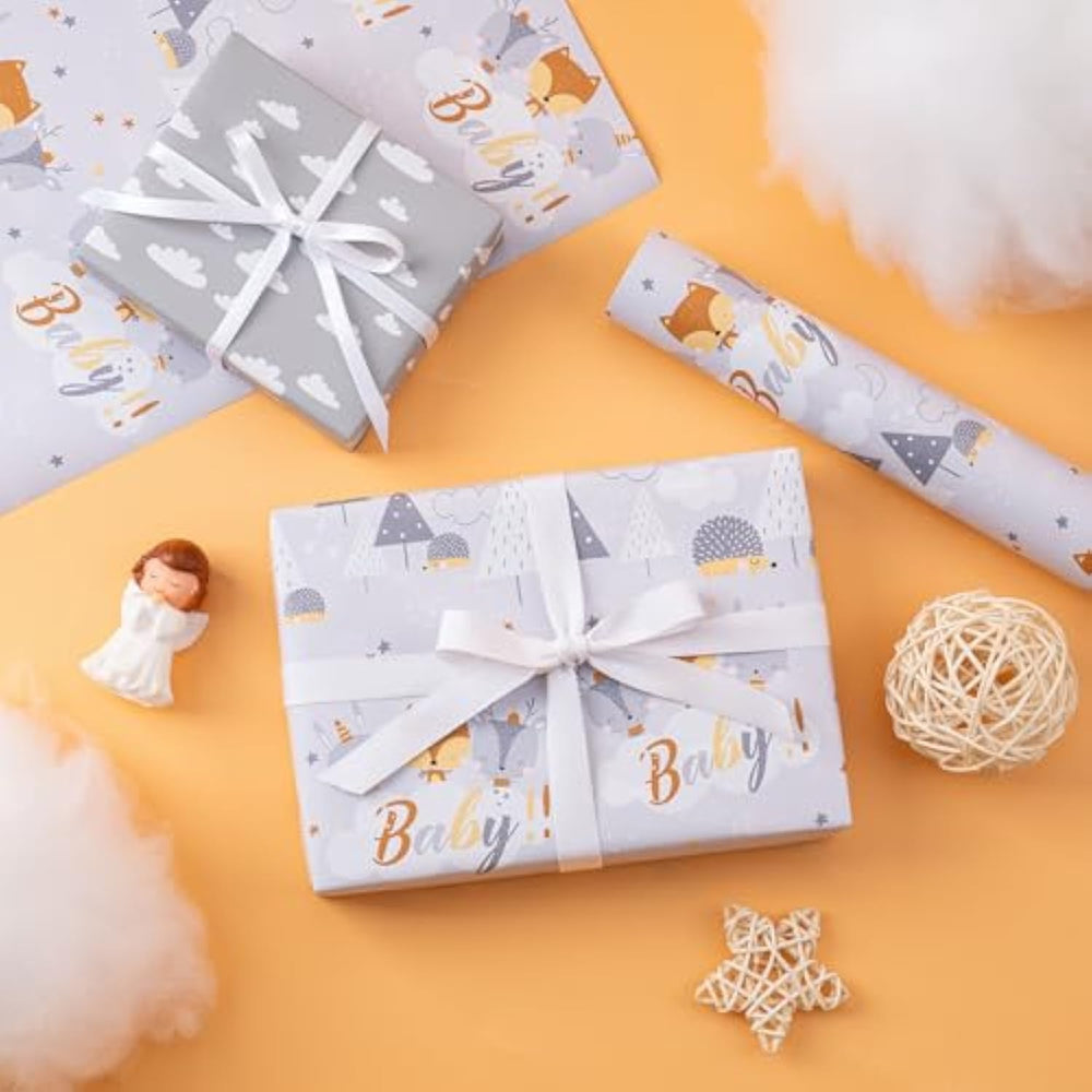 Perfect Size: Each Roll Measures 17 Inches Wide By 33 Feet Long | Reversible: Cute Animals And "Hello!!" Lettering Printed On One Side, Grey And White Cloud Printed On The Reverse, Two Different Designs Make Unique And Varied Gift Presentations Easy | Premium Quality: Created With High-Quality Paper Materials, Thick And Not Easily Tear Or Rip, Item Came With Shrink Film To Prevent Wrapping Paper From Scratches And Reduce Dust | Use All Occasion: Perfect For Neutral Baby Shower, Boy Girls Kids Birthday, Holiday, Party Gifts Wrap, It Is Also Great For Craft Project | Quality