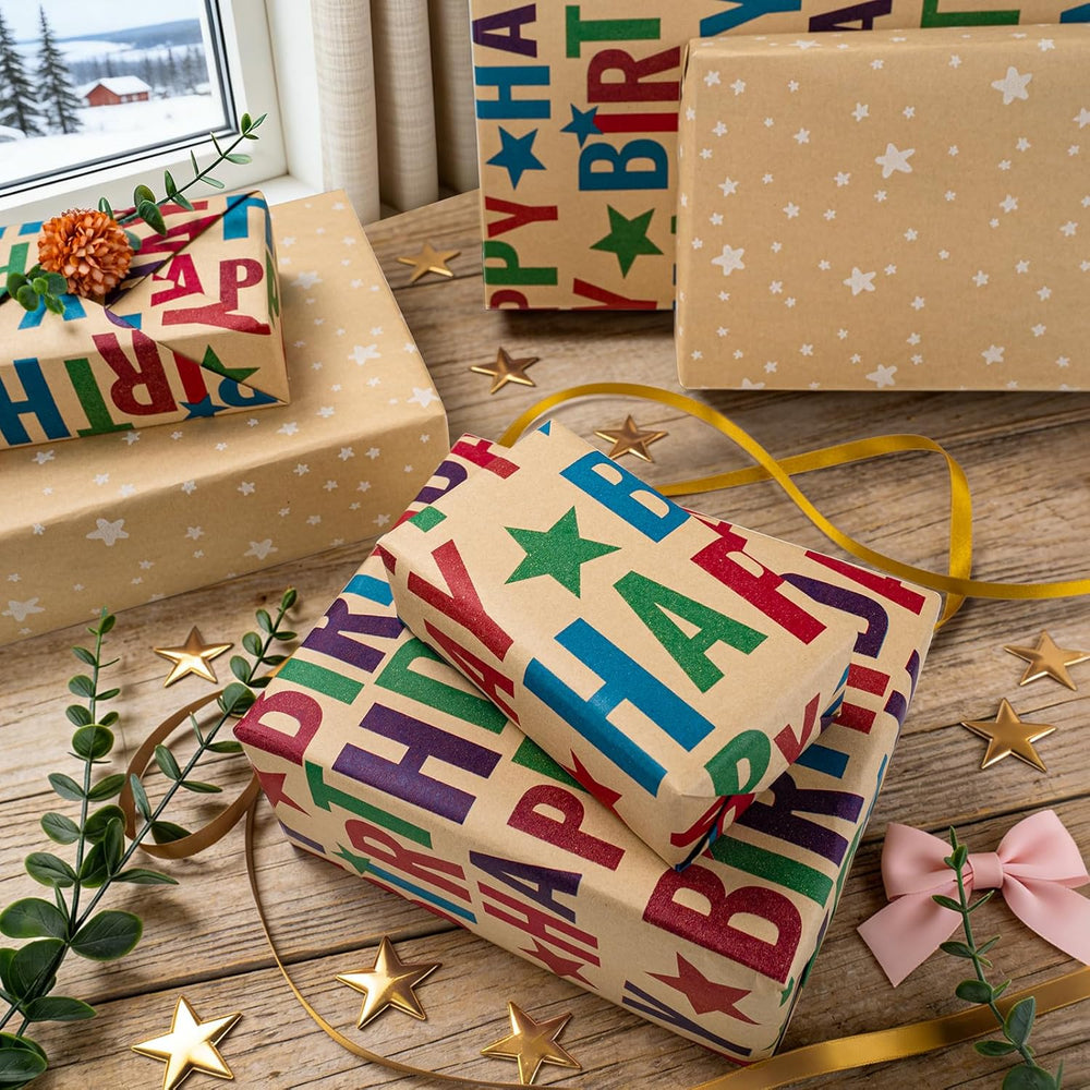 | Reversible Birthday Design: This Birthday Wrapping Paper Roll Is Double-Sided Printed. The Front Is Composed Of Colorful "Happy Birthday" Text Patterns, While The Back Is Made Up Of White Stars Of Different Sizes. Two Different Unique Designs Make The Birthday Gift Packaging More Diverse And Give The Gifts A Stronger Birthday Atmosphere! Christmas Wrapping Paper And Perfect Size: This Christmas Wrapping Paper Measures 17 In X 32.8 Ft / 43 Cm X 10 M, Which Can Be Freely Cut To The Size You Want. Perfect For Packing Medium And Small Gift Boxes High Quality Paper: This Christmas Gift Wrapping Paper Is Made Of 80G High Quality Kraft Paper, Which Is Durable And Not Easy To Tear. The Wrapping Paper Comes With Shrink Film To Reduce Dust And Prevent Scratches Easy To Store: This Christmas Roll Takes Up No Space And Is Easy To Store. At The Same Time, It Is Packed With Heat Shrink Film, Without Any Creases And Scratches After Opening, So That Your Gift Is More Beautiful And Perfect Suitable For Multiple Occasions: This Birthday Wrapping Paper Rolls Are Not Only Used For Birthdays But Also For Parties, Event Celebrations, Galas, Weddings, Graduation Ceremonies And Other Occasions. At The Same Time Can Be Used For Christmas Decoration, Handmade Diy Creation And Bouquet Packaging, Is The Perfect Ideal Wrapping Paper