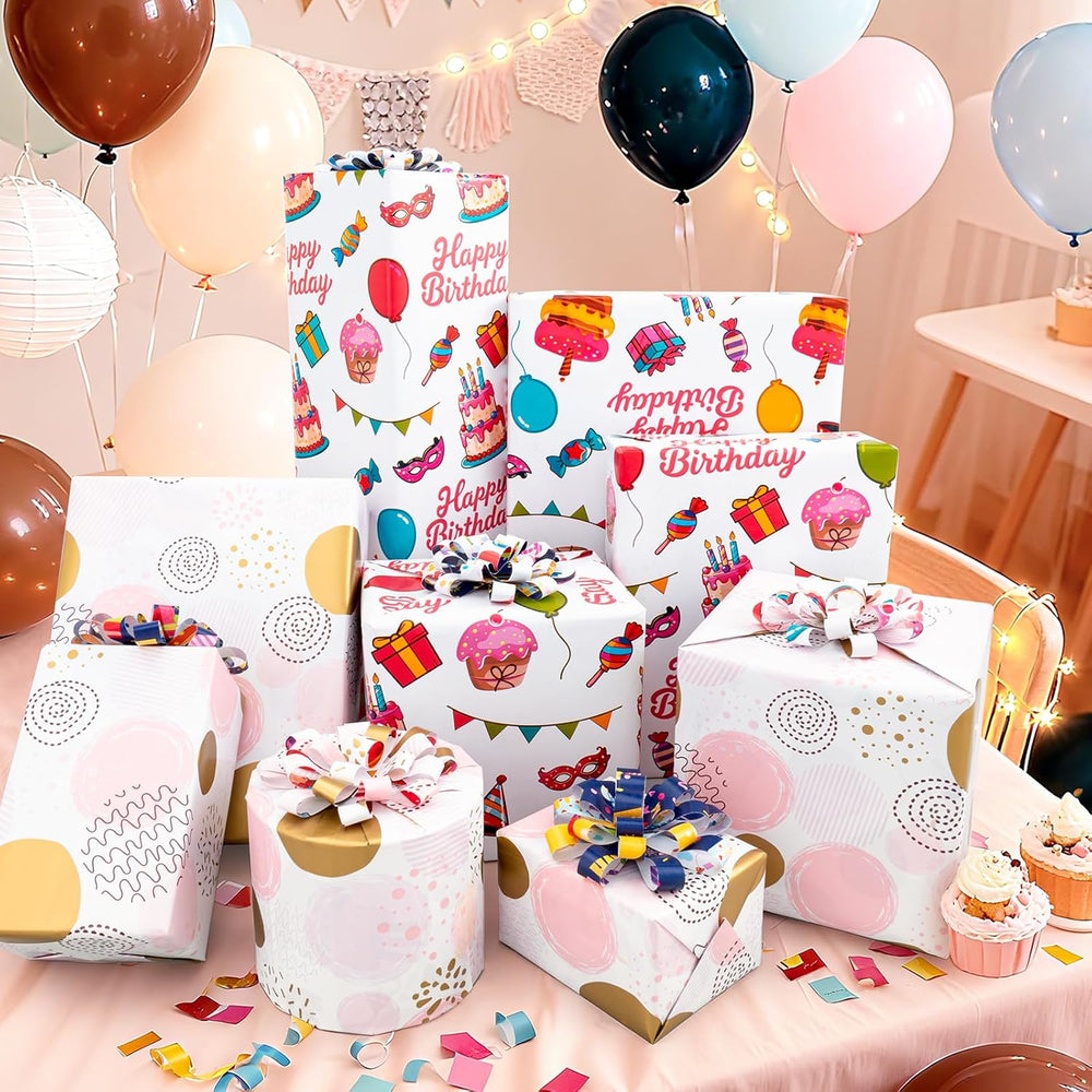 | Reversible Birthday Design: This Birthday Wrapping Paper Roll Is Double-Sided Printed. The Front Is Composed Of Patterns Such As Birthday Cakes, Balloons, And Gift Boxes, While The Back Is Made Up Of Pink And Yellow Circles. Two Different Unique Designs Make The Birthday Gift Packaging More Diverse And Give The Gifts A Stronger Birthday Atmosphere Christmas Wrapping Paper And Perfect Size: This Christmas Wrapping Paper Measures 17 In X 32.8 Ft / 43 Cm X 10 M, Which Can Be Freely Cut To The Size You Want. Perfect For Packing Medium And Small Gift Boxes High Quality Paper: This Christmas Gift Wrapping Paper Is Made Of 80 G High Quality Coated Paper, Which Is Durable And Not Easy To Tear. The Wrapping Paper Comes With Shrink Film To Reduce Dust And Prevent Scratches Easy To Store: This Christmas Roll Takes Up No Space And Is Easy To Store. At The Same Time, It Is Packed With Heat Shrink Film, Without Any Creases And Scratches After Opening, So That Your Gift Is More Beautiful And Perfect Suitable For Multiple Occasions: This Birthday Wrapping Paper Rolls Are Not Only Used For Birthdays But Also For Parties, Event Celebrations, Galas, Weddings, Graduation Ceremonies And Other Occasions. At The Same Time Can Be Used For Christmas Decoration, Handmade Diy Creation And Bouquet Packaging, Is The Perfect Ideal Wrapping Paper