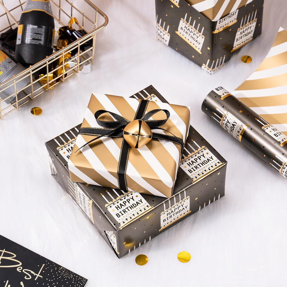 | Glamorous Birthday Cake Wrapping Paper: This Elegant Wrapping Paper Features A Stylish Black And Gold Color Scheme, Adorned With Intricate Patterns Of Birthday Cakes And Candles, Alongside The Words "Happy Birthday" In A Bold, Festive Font. The Alternating Stripes In Gold And White On The Reverse Side Add A Sophisticated And Modern Touch, Making It Versatile For Various Gift-Wrapping Needs. Elegant Shiny Metallic Foil: The Wrapping Paper Features A Striking Shiny Metallic Foil Finish, Adding A Touch Of Luxury And Elegance To Your Gift Presentation. The Reflective Foil Enhances The Visual Appeal, Making The Design Pop And Catch The Light Beautifully. Compact Easy To Store: This Wrapping Paper Measures 17 Inches Wide By 32.8 Feet Long, Offering A Total Of 46.45 Square Feet. Its Compact Size Is Ideal For Wrapping Small To Medium-Sized Gifts, And It’S Easy To Store Among Your Craft Supplies, Saving You Valuable Space Premium Quality Durability: Made From High-Quality 80Gsm Coated Paper, This Gift Wrap Is Thick, Tear-Resistant, And Highly Durable. It Provides Exceptional Strength To Keep Your Gifts Beautifully Wrapped Without Ripping Or Wrinkling Perfect For Birthday Celebrations: This Wrapping Paper Is Perfect For Birthday Celebrations, Offering A High-End, Refined Design That Suits A Wide Range Of Ages And Tastes. Ideal For Both Adults And Children, It Can Be Used For Family Members, Friends, Or Colleagues, Making It An Excellent Choice For Anyone Who Loves Chic, Luxurious Packaging.
