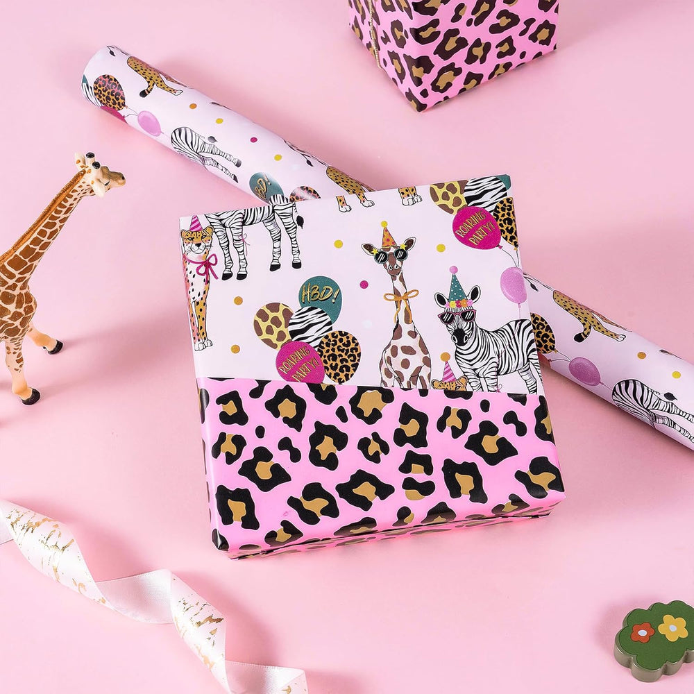 | Fun Safari Animal Birthday Theme: Bring The Party To Life With Adorable Giraffes, Zebras, Elephants And Cheetahs All Dressed Up In Party Hats. Surrounded By Colorful Balloons, Gifts And Cheerful "Happy Birthday" Text. Flip It Over For A Bold And Fashionable Pink Leopard Pattern. Easy To Store: The 17 Inches Wide By 16.4 Feet Long Is Designed For Convenience. The Compact Size Suitable For Small And Medium Gift Wrapping Paper, While Being Easy To Store Among Your Craft Supplies High-Quality Paper: Crafted With Durable Paper, This Gift Wrap Offers Excellent Strength And Reliability. Tear-Resistant And Durable, It Ensures Your Gifts Stay Beautifully Wrapped Without Ripping Or Wrinkling Practical Wrapping Solution: Crafted From Durable, Responsibly Sourced Materials, Our Wrapping Paper Is Designed With Minimal Waste In Roll Packaging And A Natural Look. Its Sturdy Design Allows For Multiple Uses, Offering A Stylish And Eco-Conscious Choice Versatile For Any Occasions: From Birthday Parties And Baby Showers To Animal-Themed Events And Everyday Gifts, This Reversible Wrapping Paper Adapts To Any Celebration. Suitable For Kids, Girls And Anyone Who Loves Playful Or Chic Gift Wrap