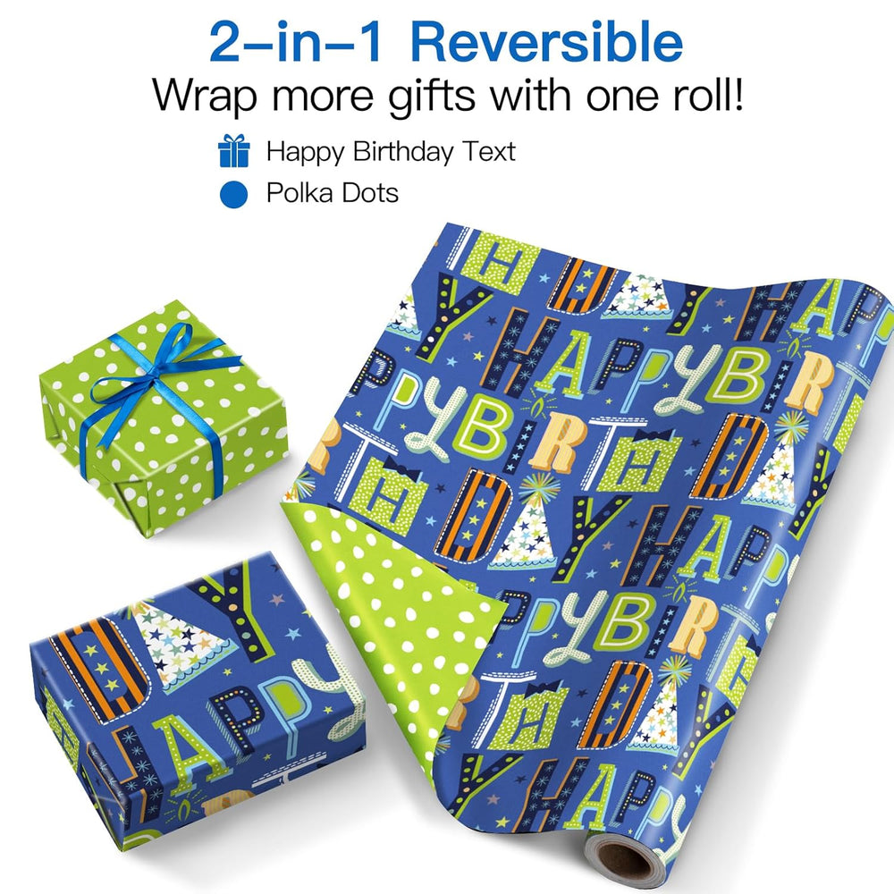 | Reversible Birthday Design: Features Two Vibrant Patterns In One Roll, Front Side With Bold "Happy Birthday" Text And Party Hats On A Blue Background, Back Side With Cheerful Green And White Polka Dots. Perfect For Switching Up Styles Or Layering Your Gift Wraps Easy To Store: The 17 Inches Wide By 16.4 Feet Long Is Designed For Convenience. The Compact Size Suitable For Small And Medium Gift Wrapping Paper, While Being Easy To Store Among Your Craft Supplies High-Quality Paper: Crafted With Durable Paper, This Gift Wrap Offers Excellent Strength And Reliability. Tear-Resistant And Durable, It Ensures Your Gifts Stay Beautifully Wrapped Without Ripping Or Wrinkling Practical Wrapping Solution: Crafted From Durable, Responsibly Sourced Materials, Our Wrapping Paper Is Designed With Minimal Waste In Roll Packaging And A Natural Look. Its Sturdy Design Allows For Multiple Uses, Offering A Stylish And Eco-Conscious Choice Perfect For Boys' Birthday: Designed With Playful Colors And Fun Patterns That Kids Love, This Wrapping Paper Adds Excitement To Any Birthday Party, School Celebration Or Gift-Giving Moment