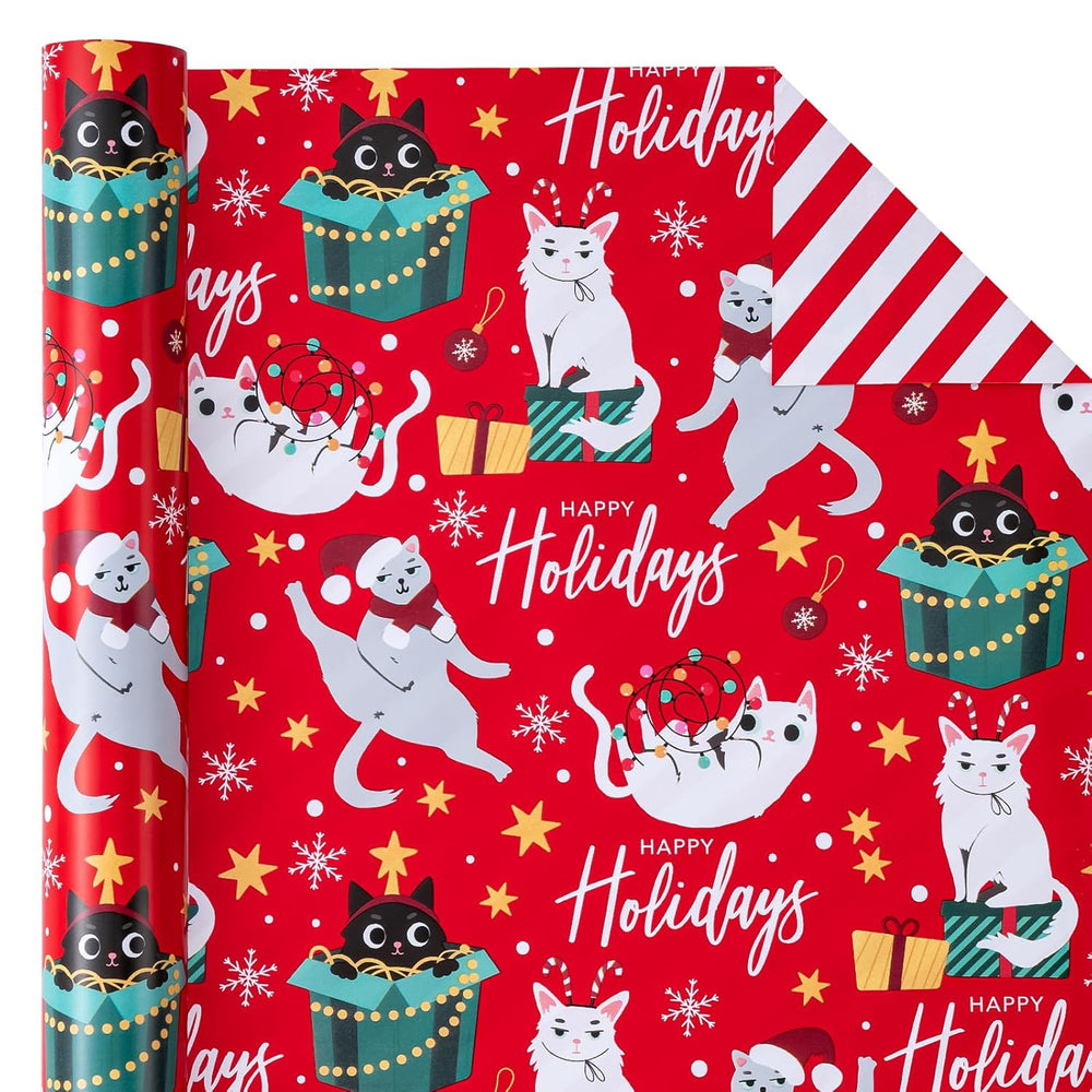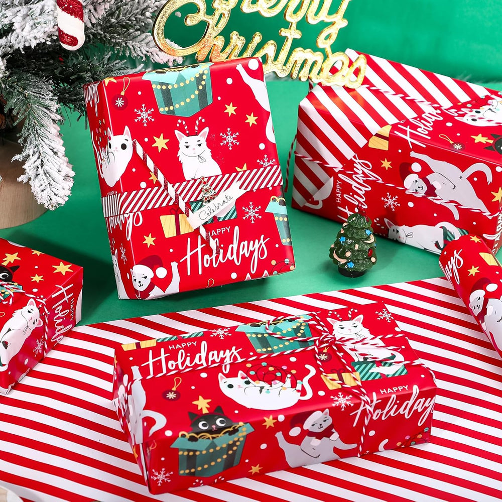 | Perfect Size: Each Roll Measures 17 Inch Wide X 33 Feet Long. Providing You With A Total Of 46.5 Square Feet Of Paper, Perfect For Any Small Or Medium Sized Gift. Reversible Design: Red Christmas Cats With "Happy Holiday" Printed On One Side, Red And White Stripes Printed On The Reverse. Two Different Designs Make Unique And Varied Gift Presentations Easy. Premium Quality: Created With High-Quality Paper Materials, Thick And Not Easily Tear Or Rip. Item Came With Shrink Film To Prevent Wrapping Paper From Scratches And Reduce Dust. Use All Winter: Whether It'S The Joyous Celebration Of Christmas Or The Holiday Season Filled With Family Gatherings And Gift - Giving Traditions, It Is An Outstanding Choice. It Is Also Great For Decorating The Christmas Tree. Wrap Your Love For Christmas: You Can Wrap Your Love With Our Special Christmas Wrapping Paper, Adding A Splash Of Color To All Of Your Gifts. Your Family, Children, And Friends Will Feel Your Sincere Christmas Wishes This Holiday Season.