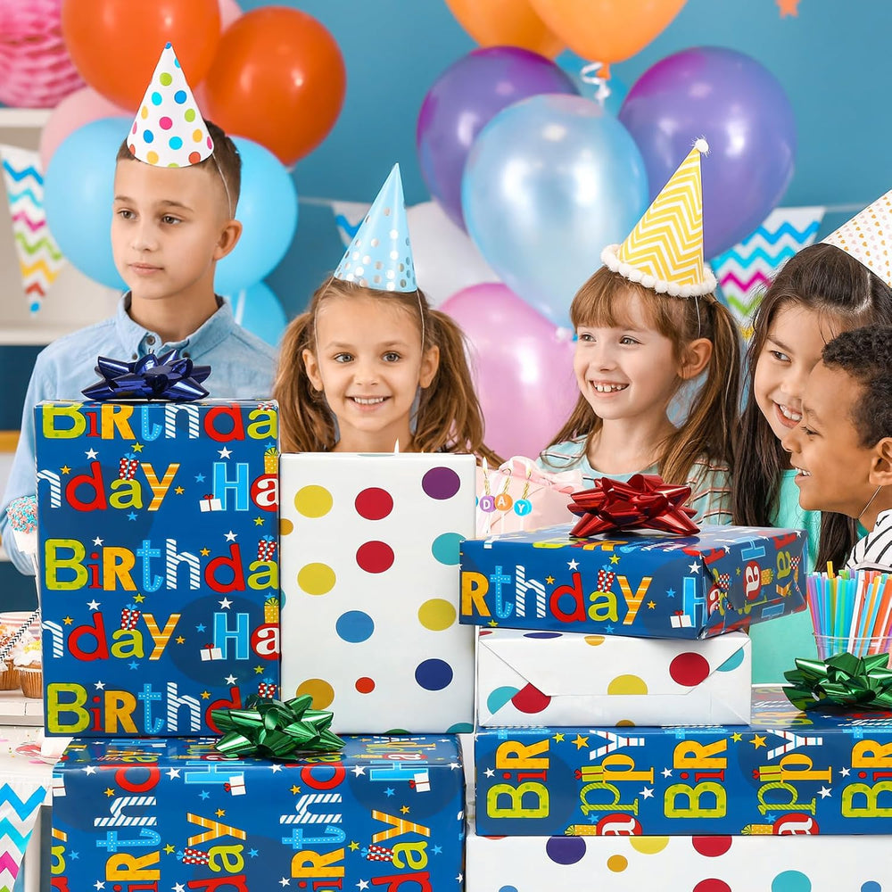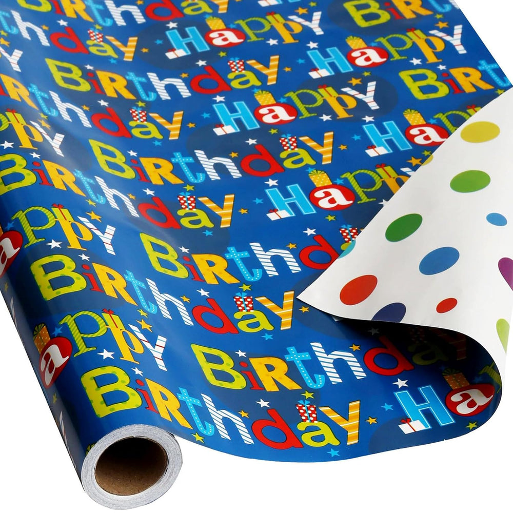 | Happy Birthday Wrapping Paper Roll: Bday Gift Wrap Paper For Kids,Boys,Girls,Men,Women,Baby Shower.Single Mini Roll,No Crease;Roll Size: 17.5Inch Width,394Inch Length,Appro.45Cm X 1000Cm,Made Of Thicken Paper Not Easy To Tear Or Rip Colorful Birthday Reversible Design: Multicolor Happy Birthday Greeting On Front,Printed Colorful Polka Dots Design On The Back,You Just Bought One Roll Paper But You Can Get Two Different Designs.Advanced Cmyk 4 Color Printing Technology Not Easy Fading,And Make The Pattern More Glossy Make Your Present More Lovely And Mysterious: Everyone Loves Mystery And Surprise,When You Carefully Wrapped A Birthday Gift For Them By Gorgeous Wrapping Paper,They Will Be Very Very Happy,And Cherish Your Bday Gift Very Much Sturdy And Durable Coated Paper: Gifts Wrap Paper Made Of High Quality Thicken Paper,Smooth Surface,Easy To Shape,Fold And Not Easy To Tear Or Rip Easy To Wrap Gift And Storage: Mini Gift Wrapping Paper Roll Great For Medium And Small Size Gifts ,Don'T Fit Very Large Gifts,Easy To Wrap And Storage