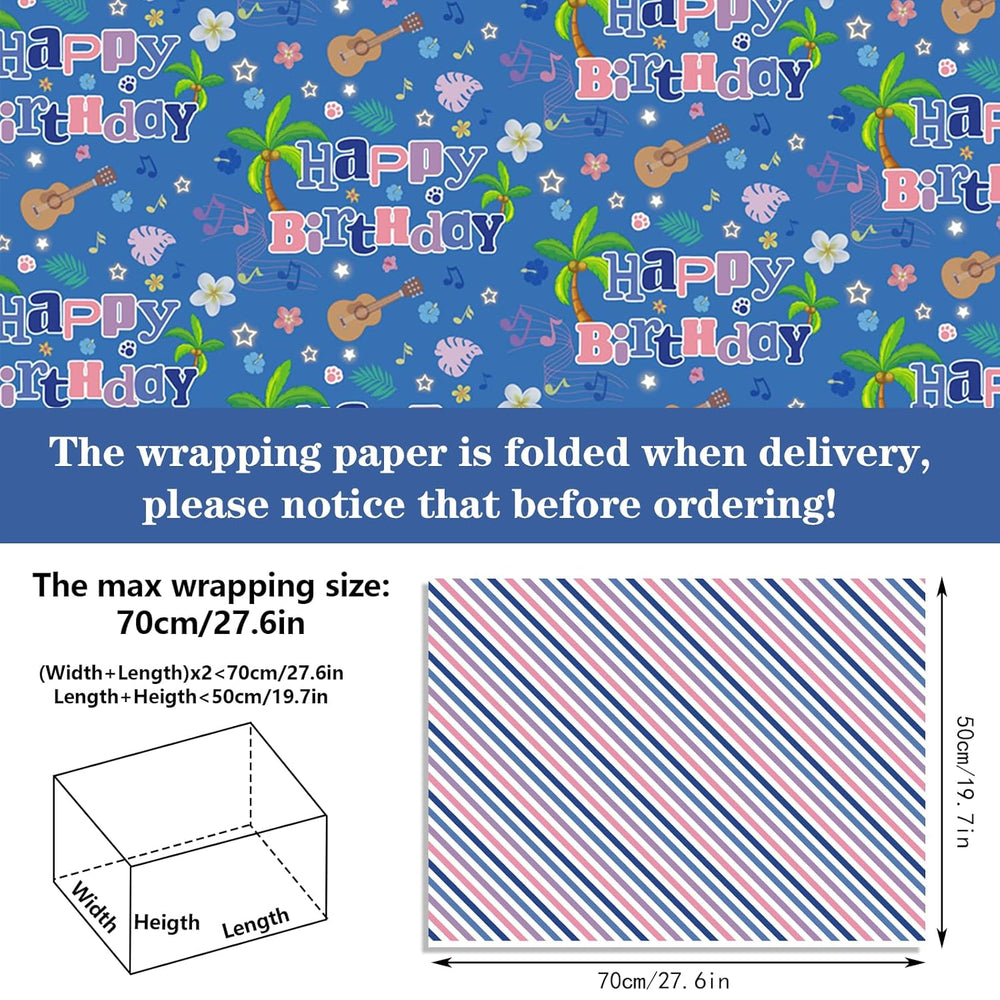 | Reversible Double-Sided Design - This Gift Wrapping Paper Features Two Charming Patterns In One: One Side Features Playful Cartoon Elements: A Cheerful "Happy Birthday" Banner, Blue-Pink Heart Balloons, Coconut Trees, Tropical Palm Leaves, Music Guitars, And Hibiscus Flowers. The Reverse Side Showcases Bold Striped Patterns In Purple/Red And Light Blue/Dark Blue. It’S Never Been Easier To Create Unique, Eye-Catching Gift Presentations For Any Celebration! Perfect Size For All Your Gift Wrapping Needs - 8 Sheets Of Precut Folded Wrapping Paper (Not Rolled) Each Sheet Measures 19.7" × 27.6" — Ideal For Wrapping Medium And Small Gifts. Need To Wrap Large Or Oversized Presents Simply Splice Multiple Sheets Together For A Seamless, Custom Fit That Makes Your Gifts Stand Out! Premium Durable Sustainable - Movie-Themed Birthday Wrap Papers Are Made Of 80Gsm Thick, Eco-Friendly Paper That Strikes The Perfect Balance: Sturdy Enough To Resist Tearing At The Corners, Yet Flexible Enough For Easy Folding And Wrapping. Vibrant, Professional Printing Ensures The Colors Pop With A Beautiful Luster — A Top-Tier Choice For Elevating Your Gift Presentation. Versatile Use For Every Occasion - Wrap Everything From Toys And Clothing To Small Keepsakes With This Adorable Blue Dog Gift Wrap Paper, And Make Every Gift Feel Packed With Love And Care. It’S A Hit For Kids, Boys, Girls, Toddlers, Daughters, Sons, Grandkids, Students, And Pet Lovers Alike! Perfect For Birthday Parties, Baby Showers, Carnival Celebrations, Congratulations Gifts, And More. Reliable