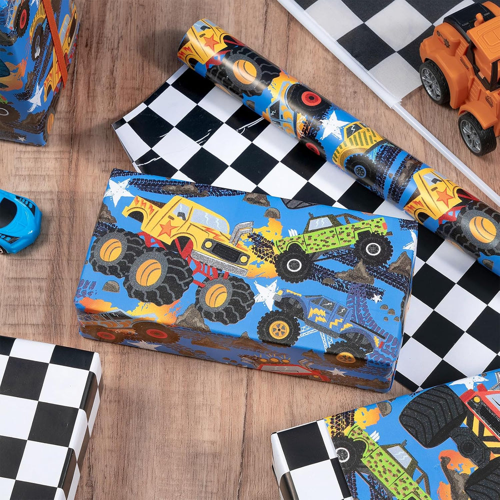 | Monster Truck Design: Features A Double-Sided Design, One Side With Bold Monster Trucks On A Dark Blue Background, And The Other With A Classic Black-And-White Checkered Pattern. Flip For A Totally Different Look! Easy To Store: The 17 Inches Wide By 16.4 Feet Long Is Designed For Convenience. The Compact Size Suitable For Small And Medium Gift Wrapping Paper, While Being Easy To Store Among Your Craft Supplies High-Quality Paper: Crafted With Durable Paper, This Gift Wrap Offers Excellent Strength And Reliability. Tear-Resistant And Durable, It Ensures Your Gifts Stay Beautifully Wrapped Without Ripping Or Wrinkling Practical Wrapping Solution: Crafted From Durable, Responsibly Sourced Materials, Our Wrapping Paper Is Designed With Minimal Waste In Roll Packaging And A Natural Look. Its Sturdy Design Allows For Multiple Uses, Offering A Stylish And Eco-Conscious Choice Perfect For Birthday Celebrations: Whether You'Re Celebrating A Kid'S Birthday, Surprising A Friend Or Adding Fun To Party Favors, This Reversible Monster Truck Wrapping Paper S Smiles Before The Gift Is Even Opened